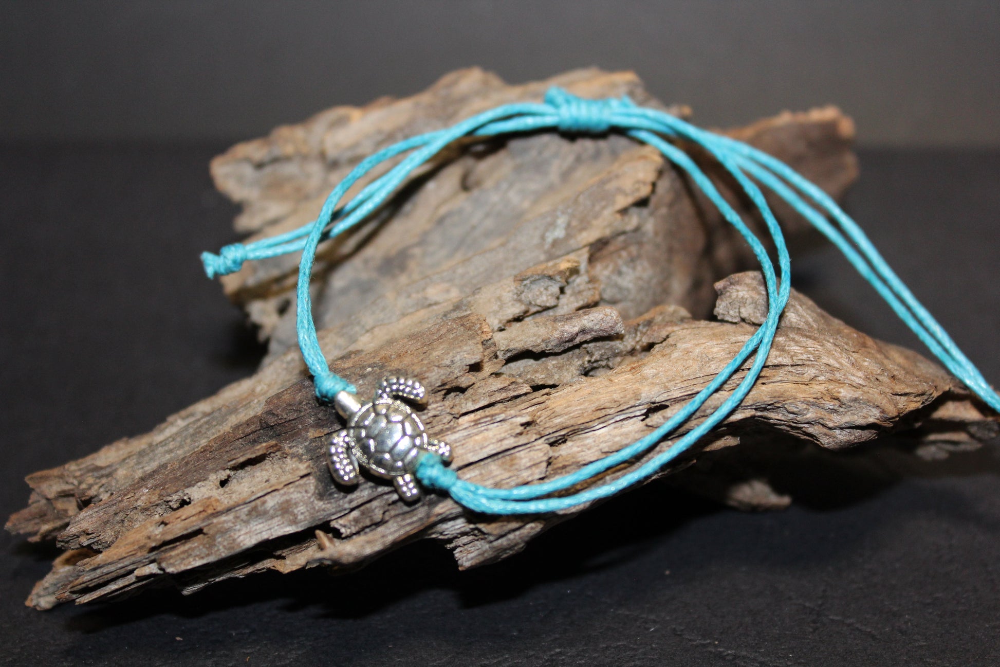 Blue cotton adjustable Macrame Anklet/Bracelet with silver turtle charm.