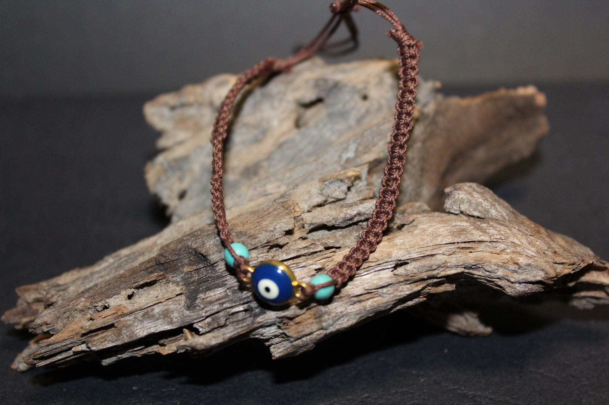 Brown cotton adjustable Macrame Anklet/Bracelet with the protective 'Evil Eye' charm and blue howlite beads.