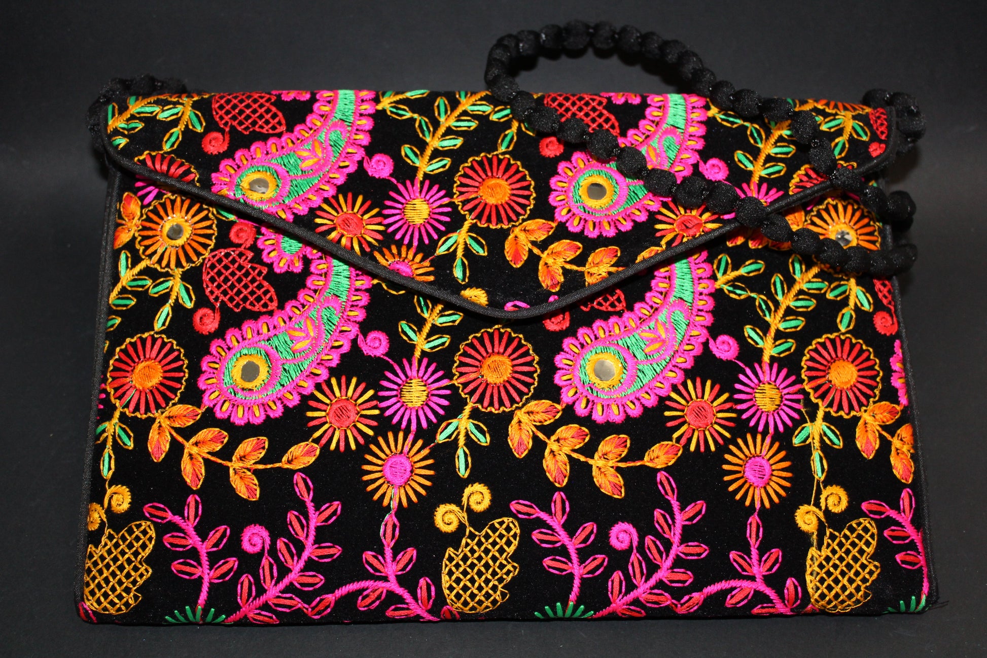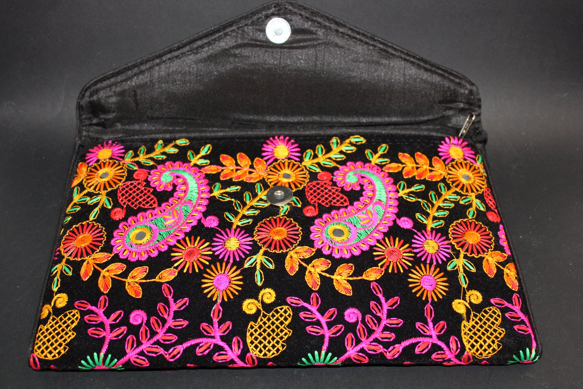 Large embroidered clutch bag/shoulder bag. Closes with large zipper and outside clip. Has internal zippered pocket - 290mm x 190mm