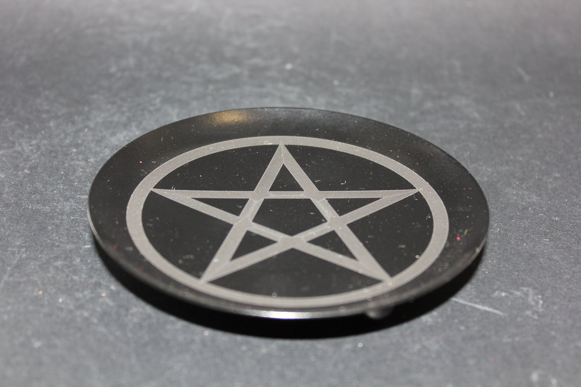 | Round metal tray with etched Pentagram. Can be used as a candle holder or for crystal display etc - 110mm round - 20mm high. |