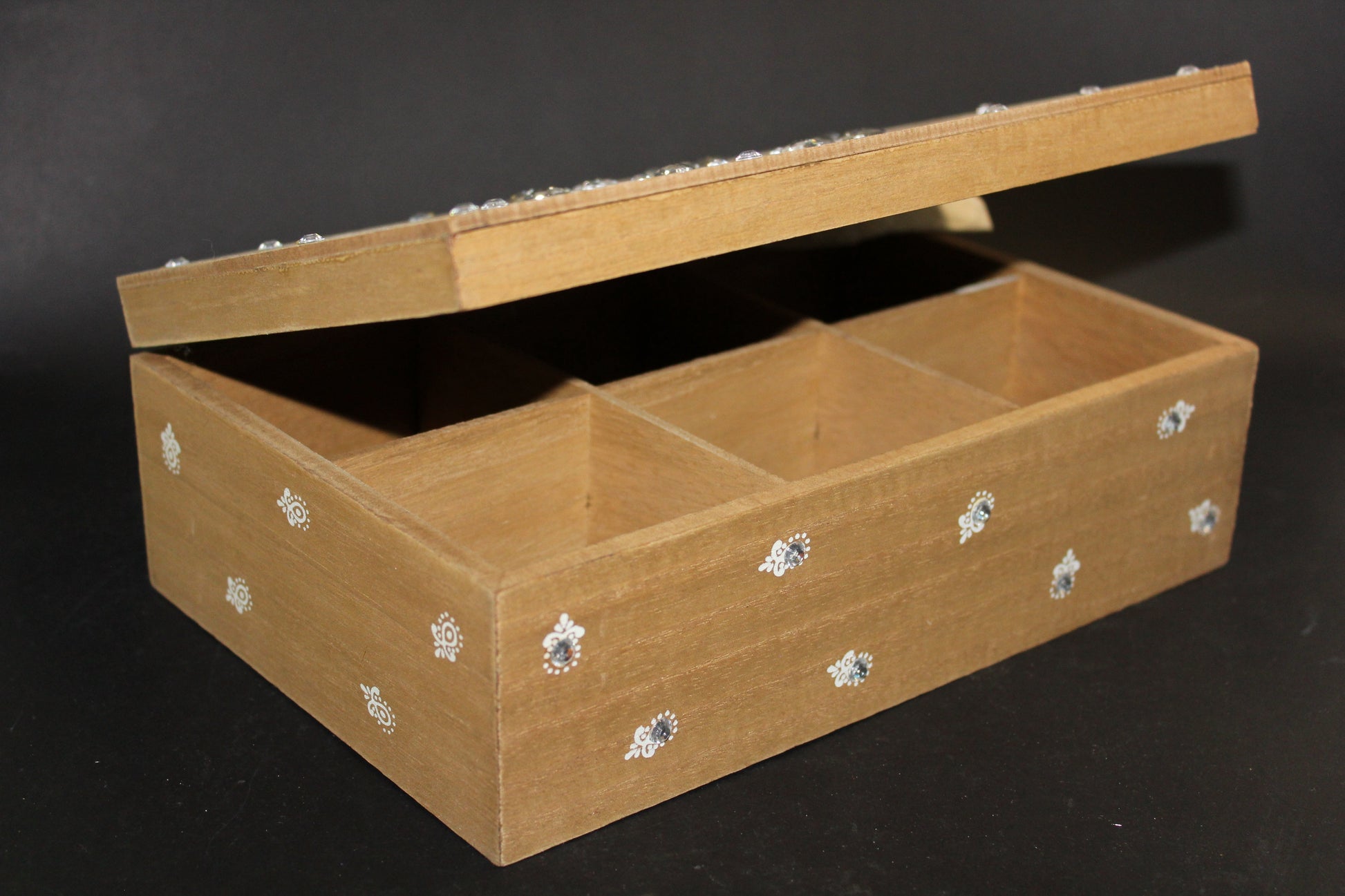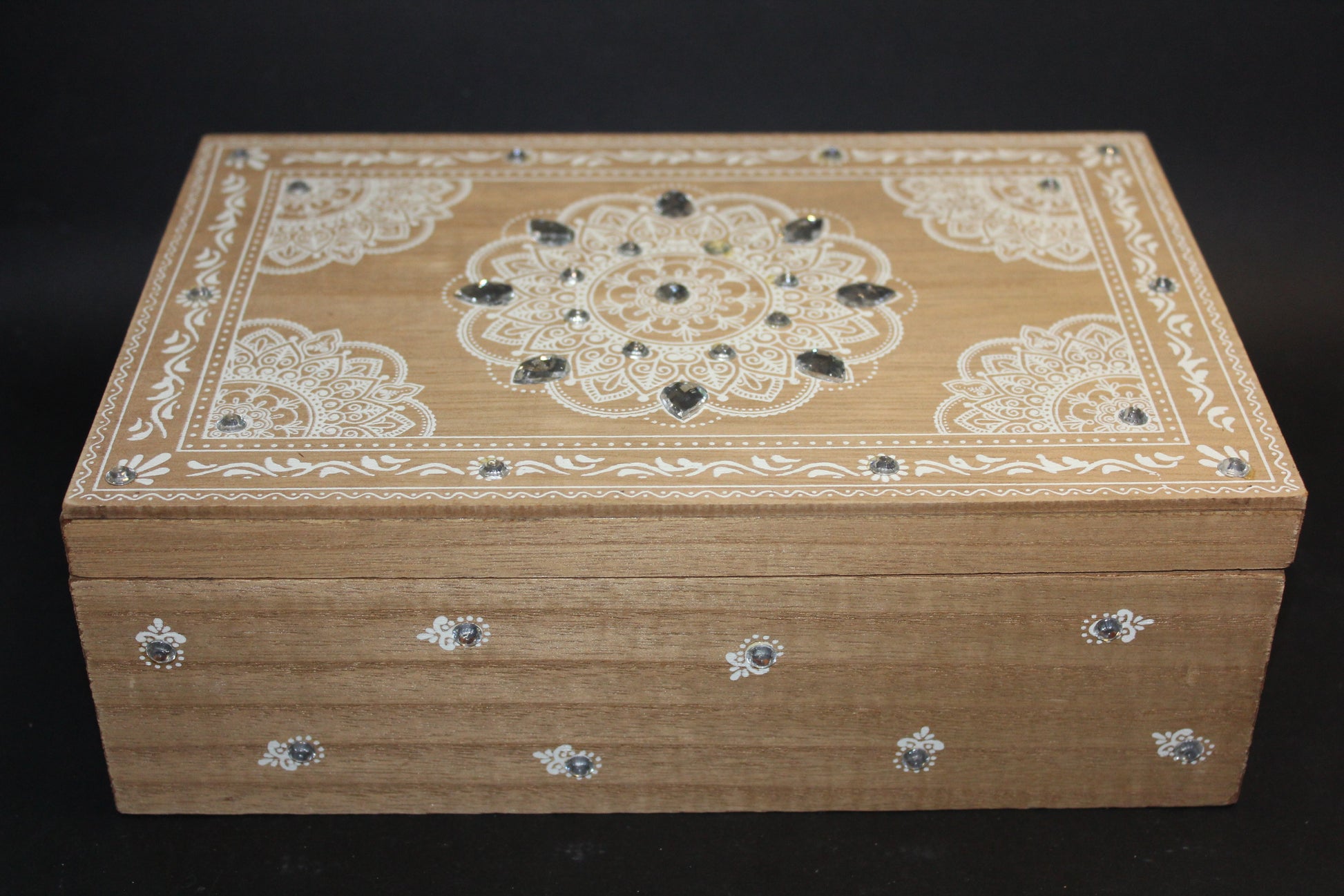 Timber box with hinged lid - BoHo Style. Decorated with mandalas and bling. Has 6 divided sections within - 240mm x 160mm - 80mm high.
