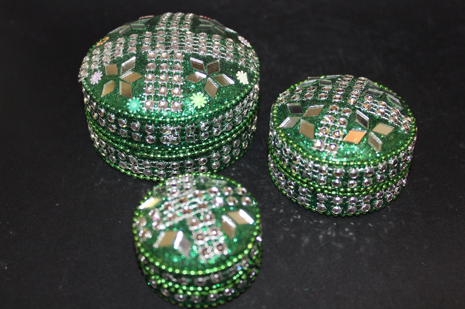 Set of 3 stacking Pill Boxes. These sturdy boxes are metal adorned with bling - Sml: round 40mm x 30mm, Med: round 60mm x 35mm, Lge: round 75mm x 45mm.