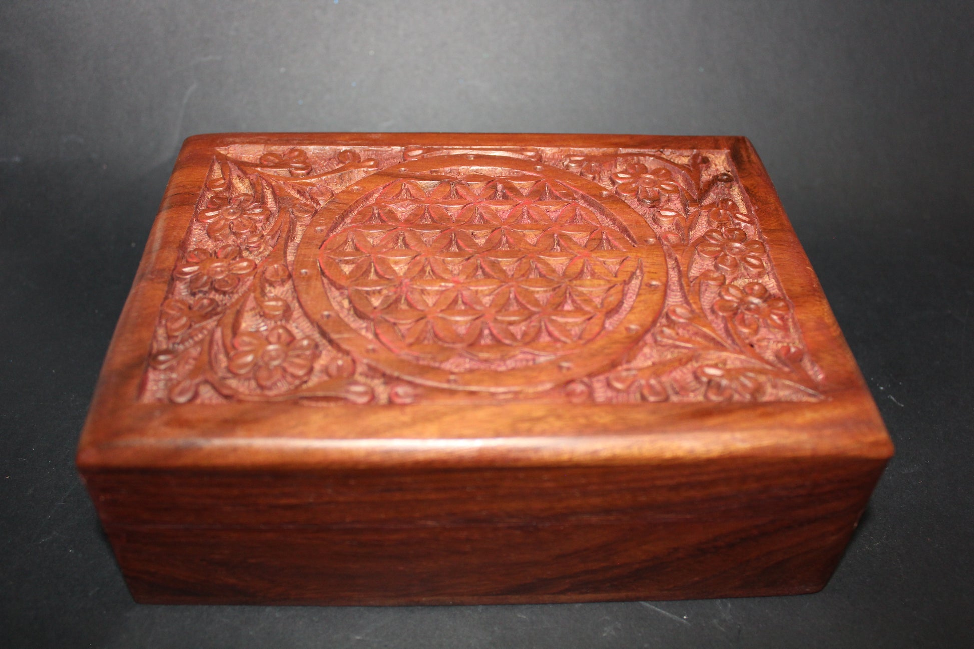 Carved timber box with hinged lid - Flower of Life - 180mm x 130mm - 60mm high.