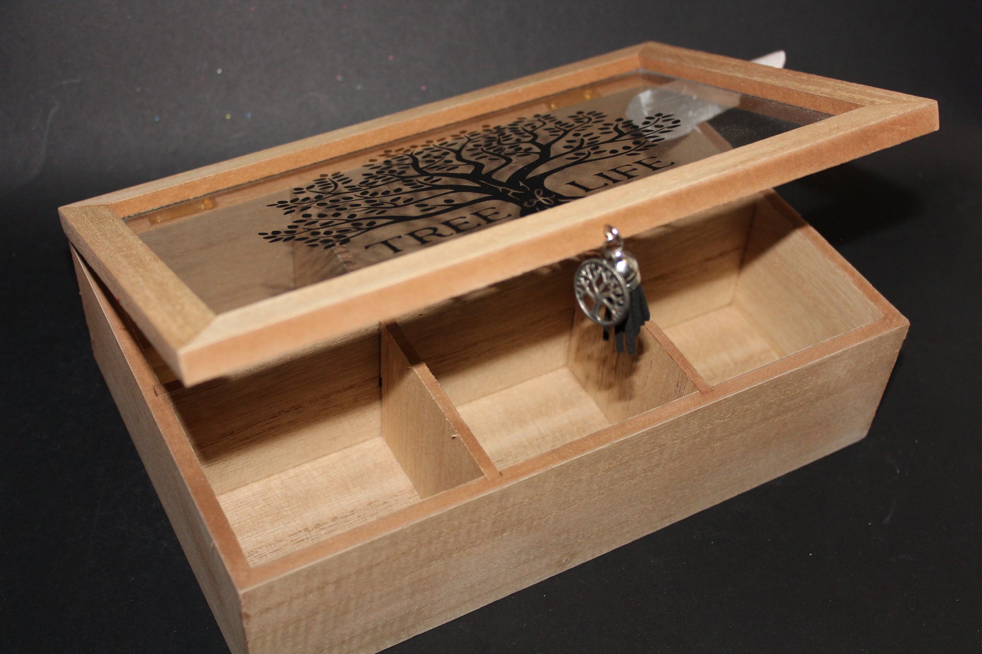 Timber Jewellery Box with hinged, glass lid with Tree of Life print and tassel. Box has 6 divided sections - 240mm x 160mm - 70mm high.