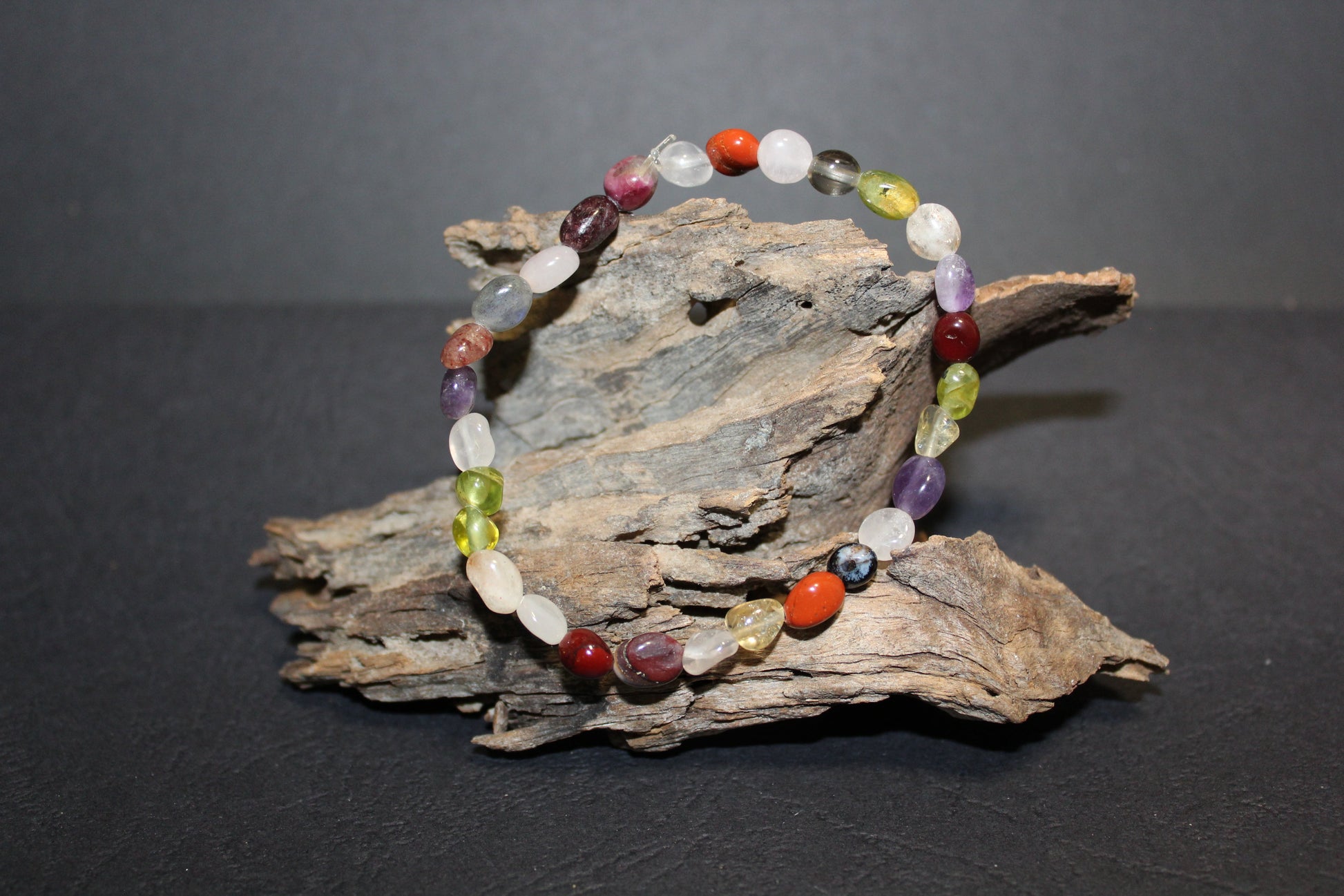 This Mixed Crystal bead bracelet is made with 6mm oval beads on elastic - Amethyst, Rose Quartz, Peridot, Garnet, Citrine, Jasper and Clear Quartz.