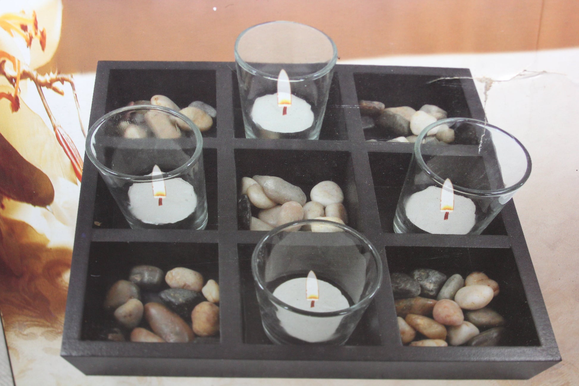 This unique, square, timber Candle Holder Set contains 4 small glass candle holders and small stones to decorate.