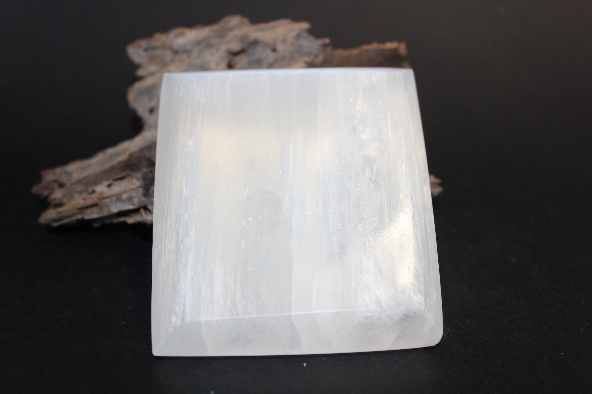 Polished Charging Plate - Square shape, carved from Selenite. Approx. 15mm (h) x 80mm (w) x 80mm (d) and 150gms. Place your crystals on the charging plate over night to cleanse, recharge and refresh them.