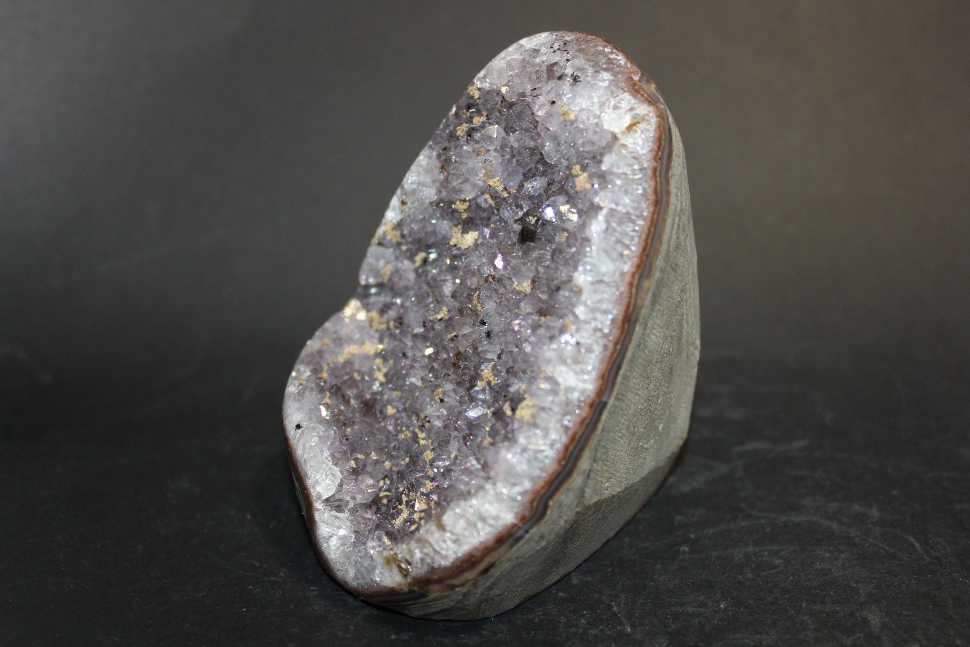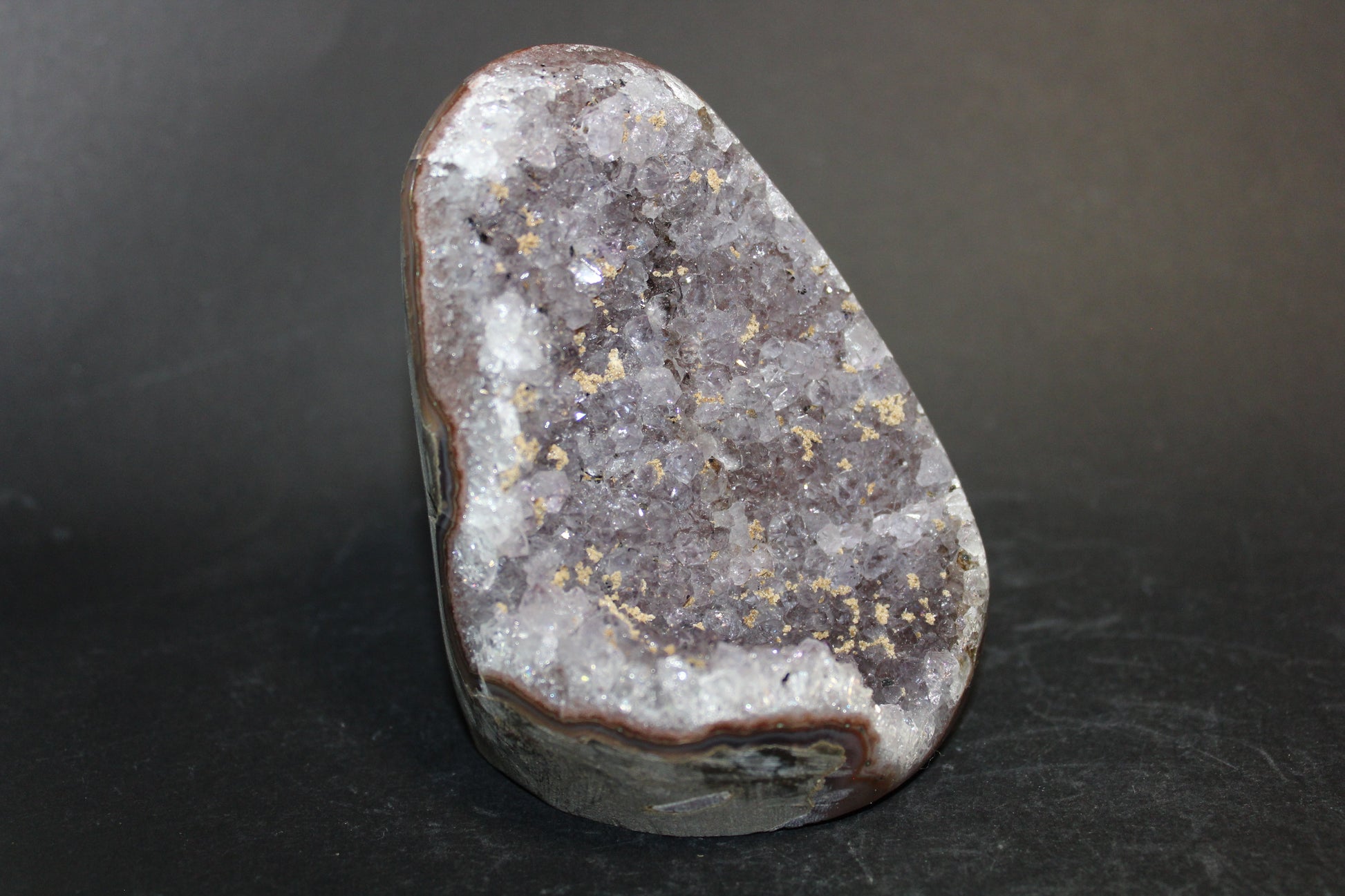 This beautiful Amethyst cave has a polished face and is 75mm (h) x 60mm (w) x 70mm (d) and weighs 337gms.