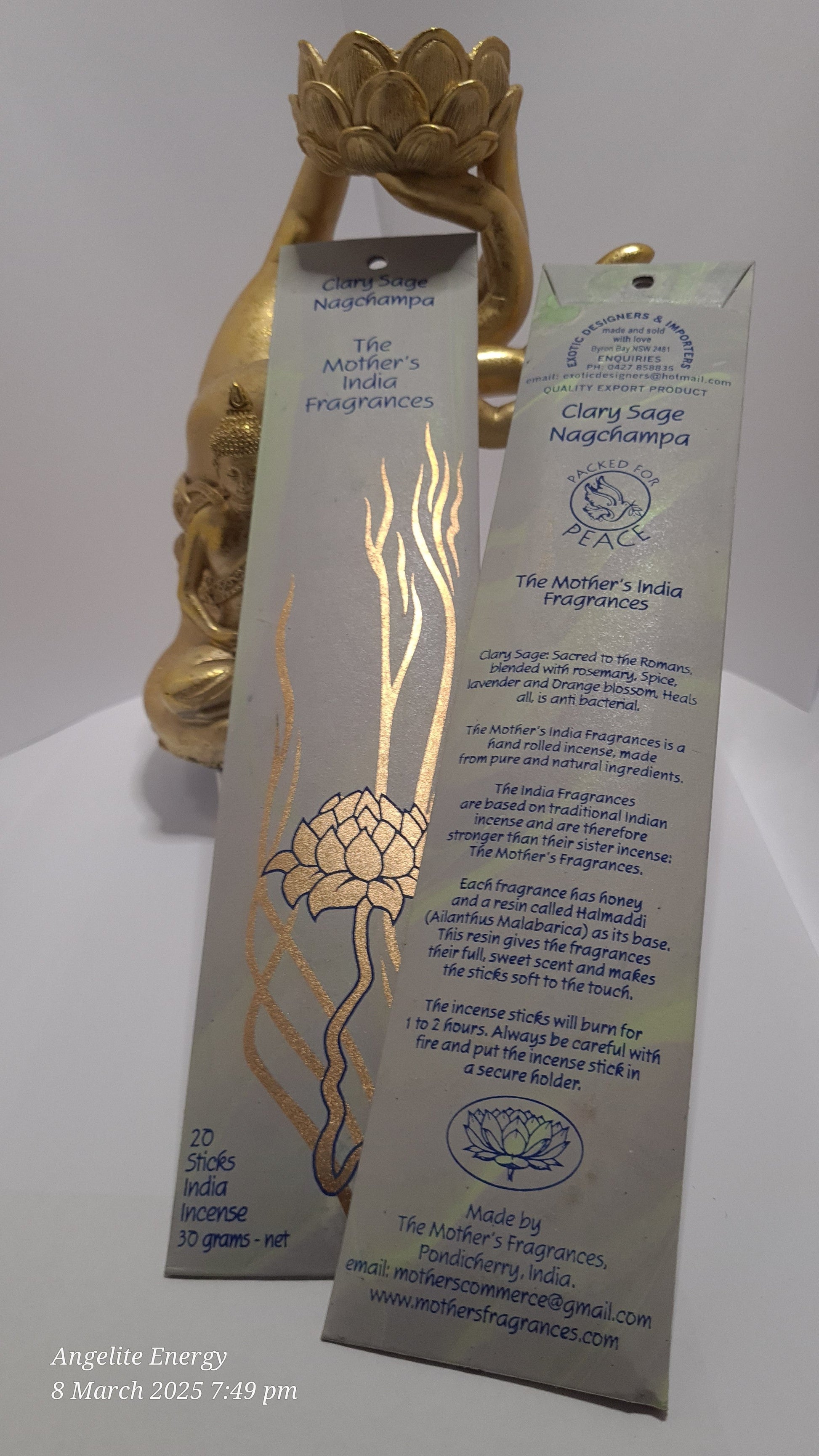 Clary Sage is a sacred incense, blended with rosemary, spice, lavender and orange blossoms. It has anti-bacterial properties. Incense sticks will burn 1-2 hours.