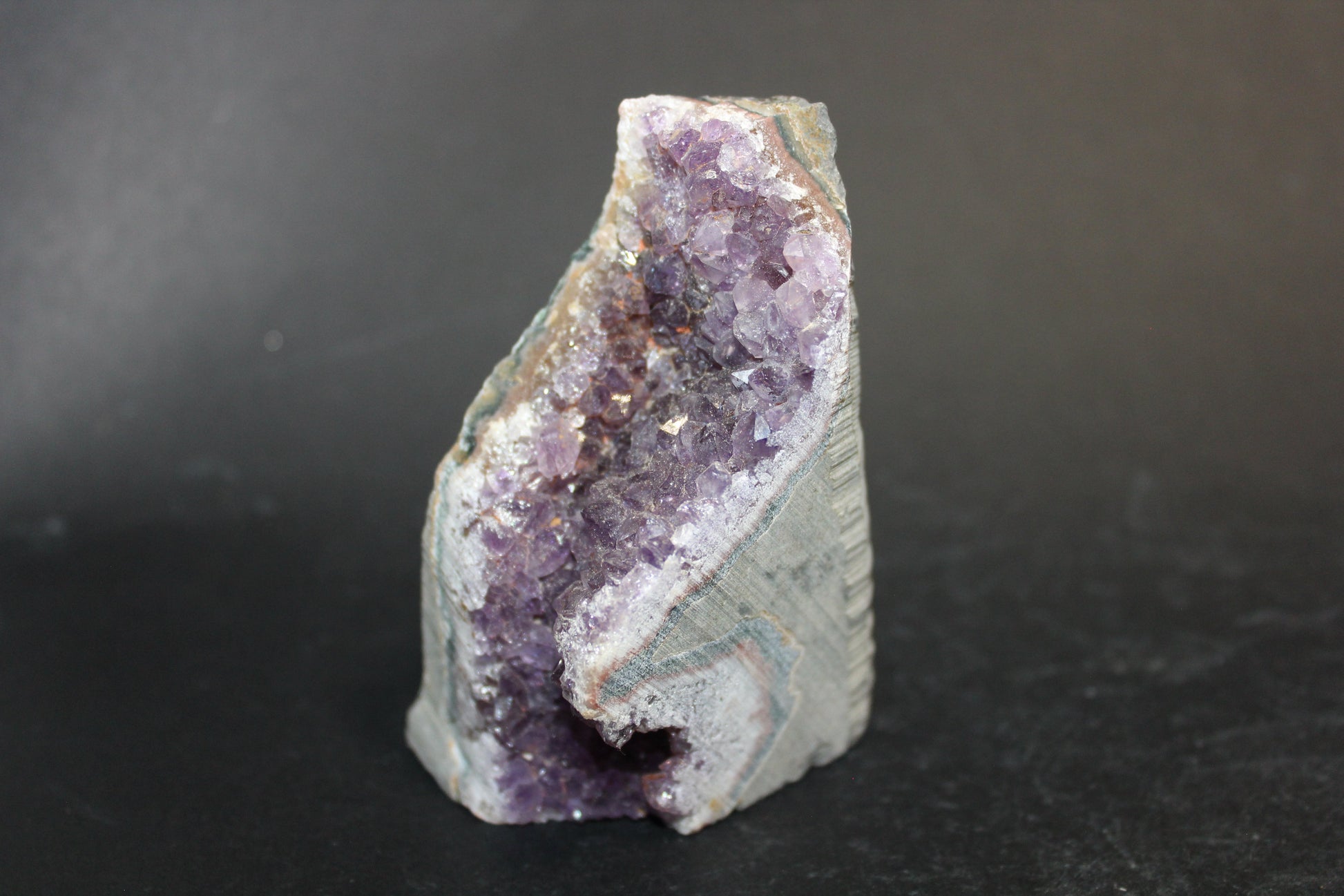 This beautiful Amethyst cluster/cave has been fashioned into a stand, has a polished face and is 75mm (h) x 35mm (w) x 45mm (d) and weighs 160gms.