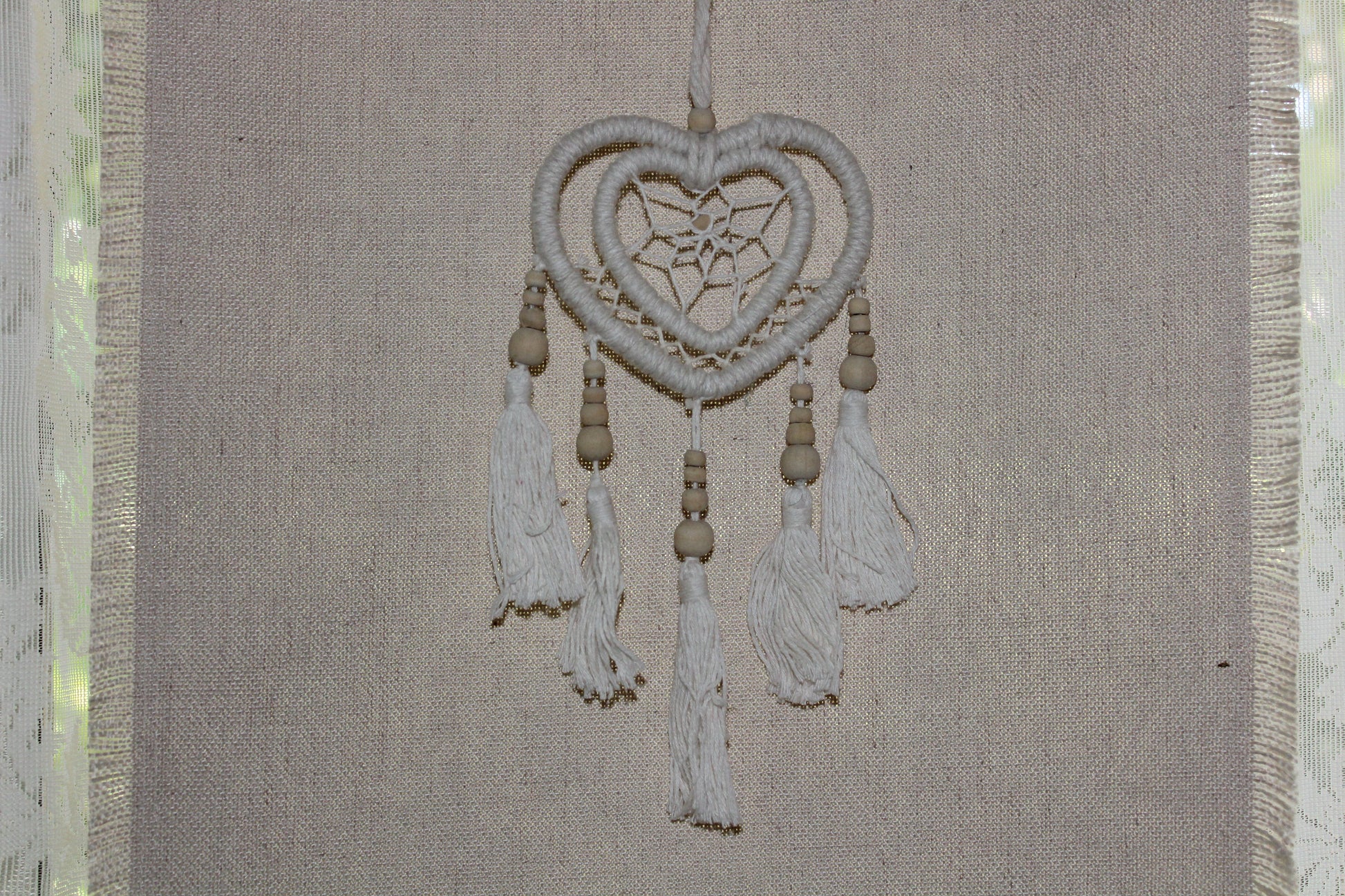 This White Rope, Heart shaped Dreamcatcher has one heart inside the other, timber beads and tassels.