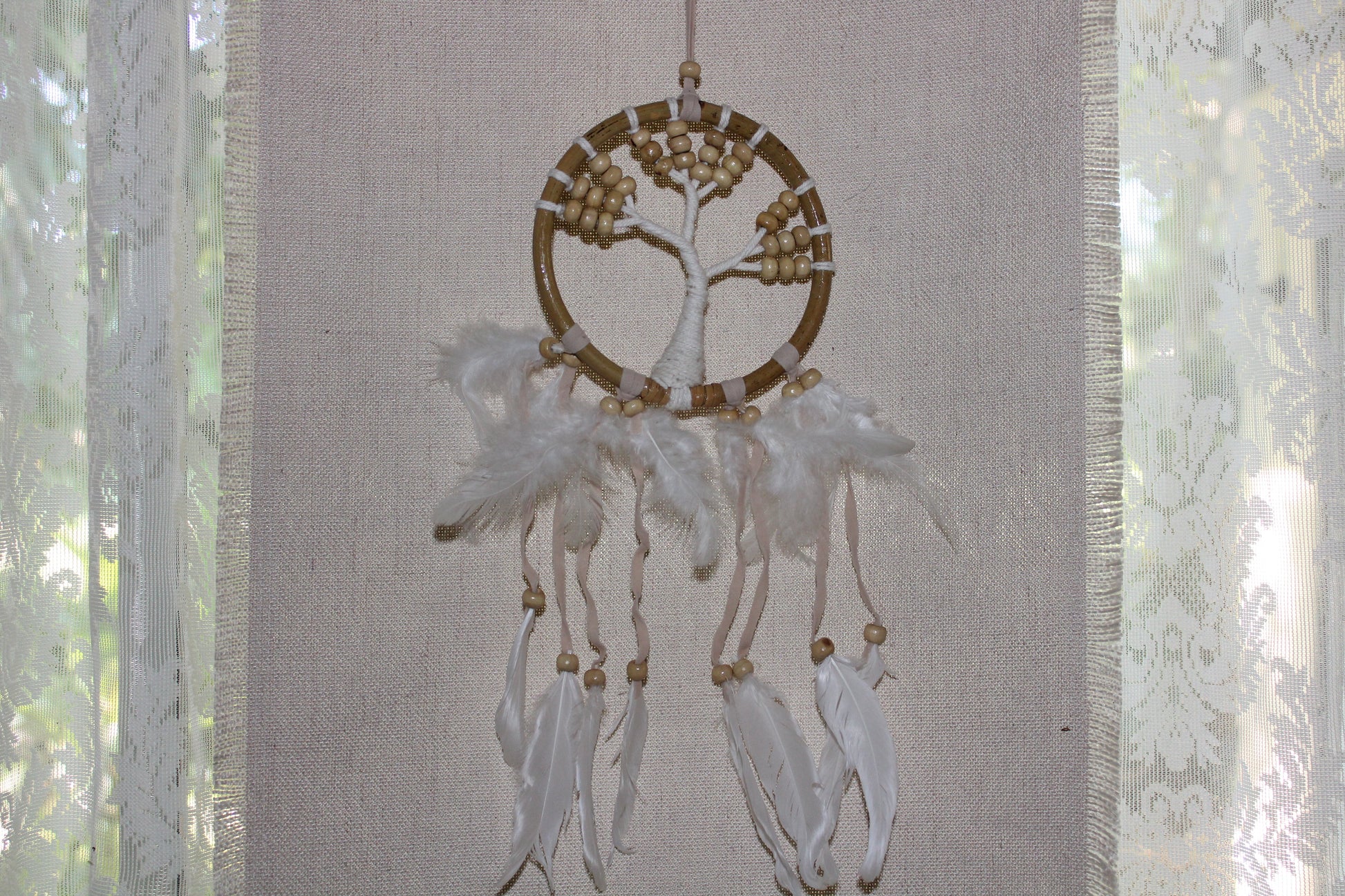 This Cane Dreamcatcher is detailed with the Tree of Life, timber beads and feathers.