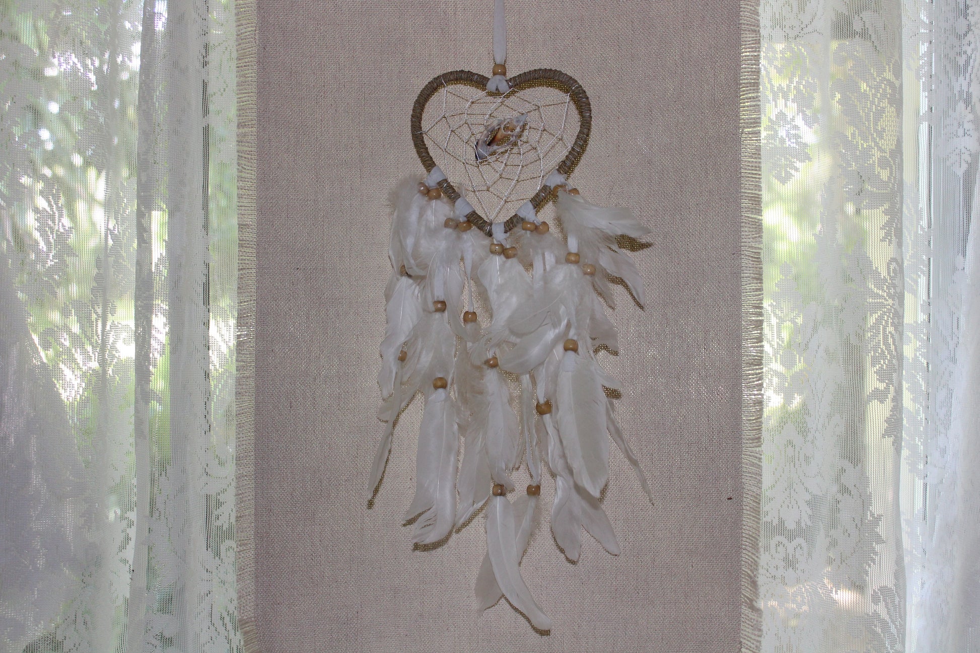 This Ratan, Heart shaped Dreamcatcher has a shell in the centre, white webbing, timber beads and feathers.