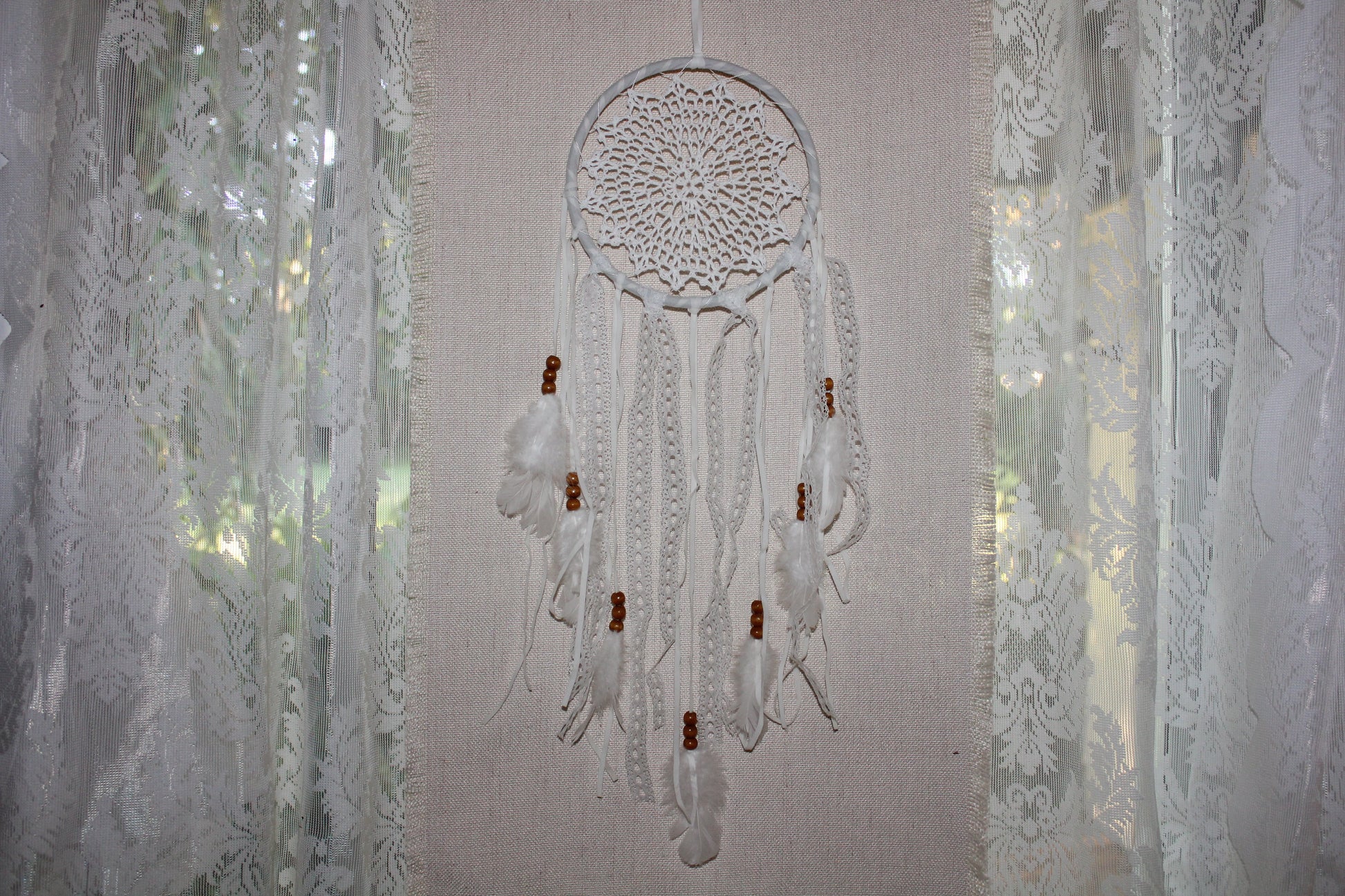 This White (crochet) Dreamcatcher is detailed with white ribbon, lace and beads with feathers.