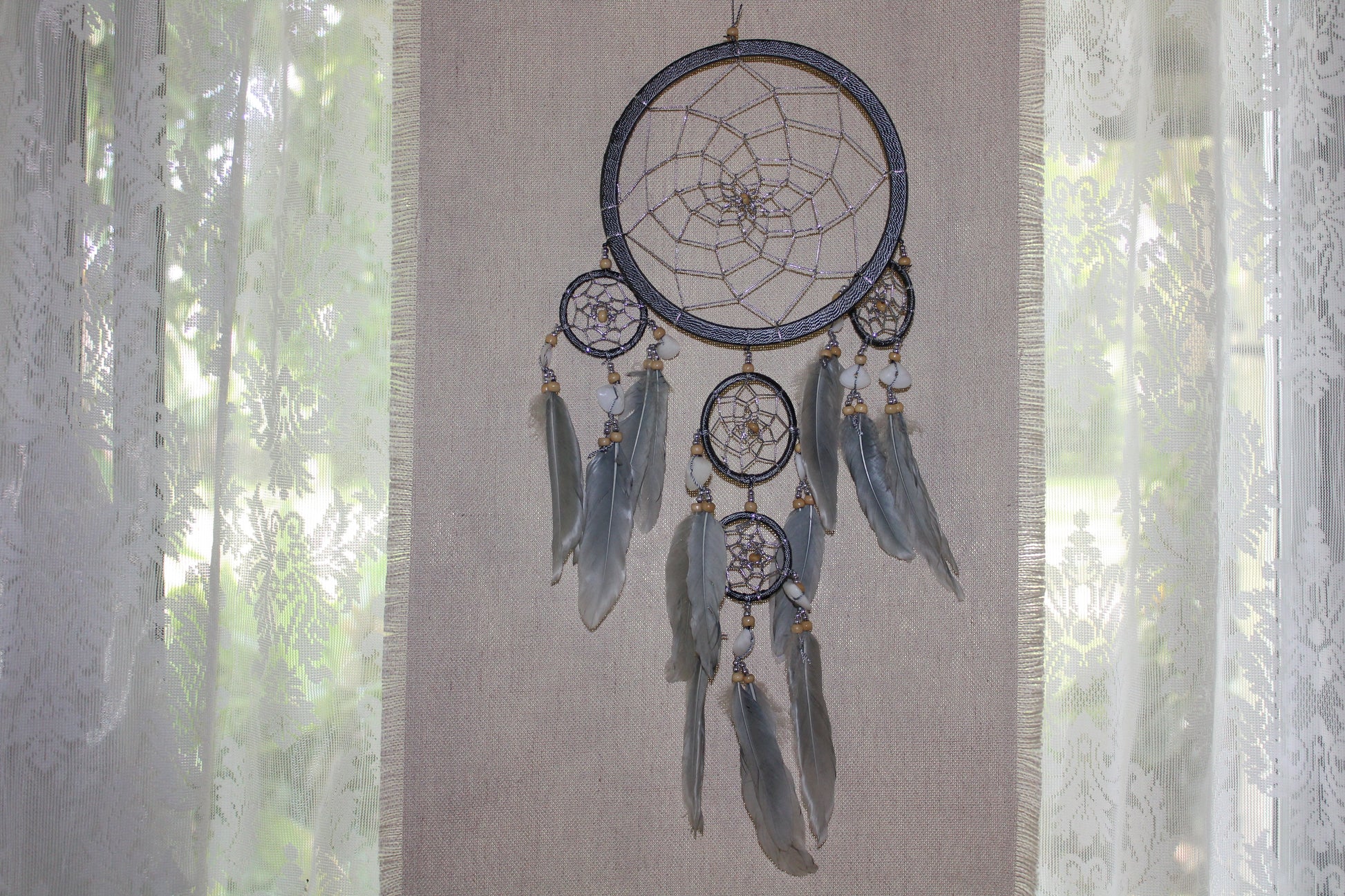 This Grey, 5 ring Dreamcatcher has pippi shells, silver webbing, silver and timber beads with feathers.