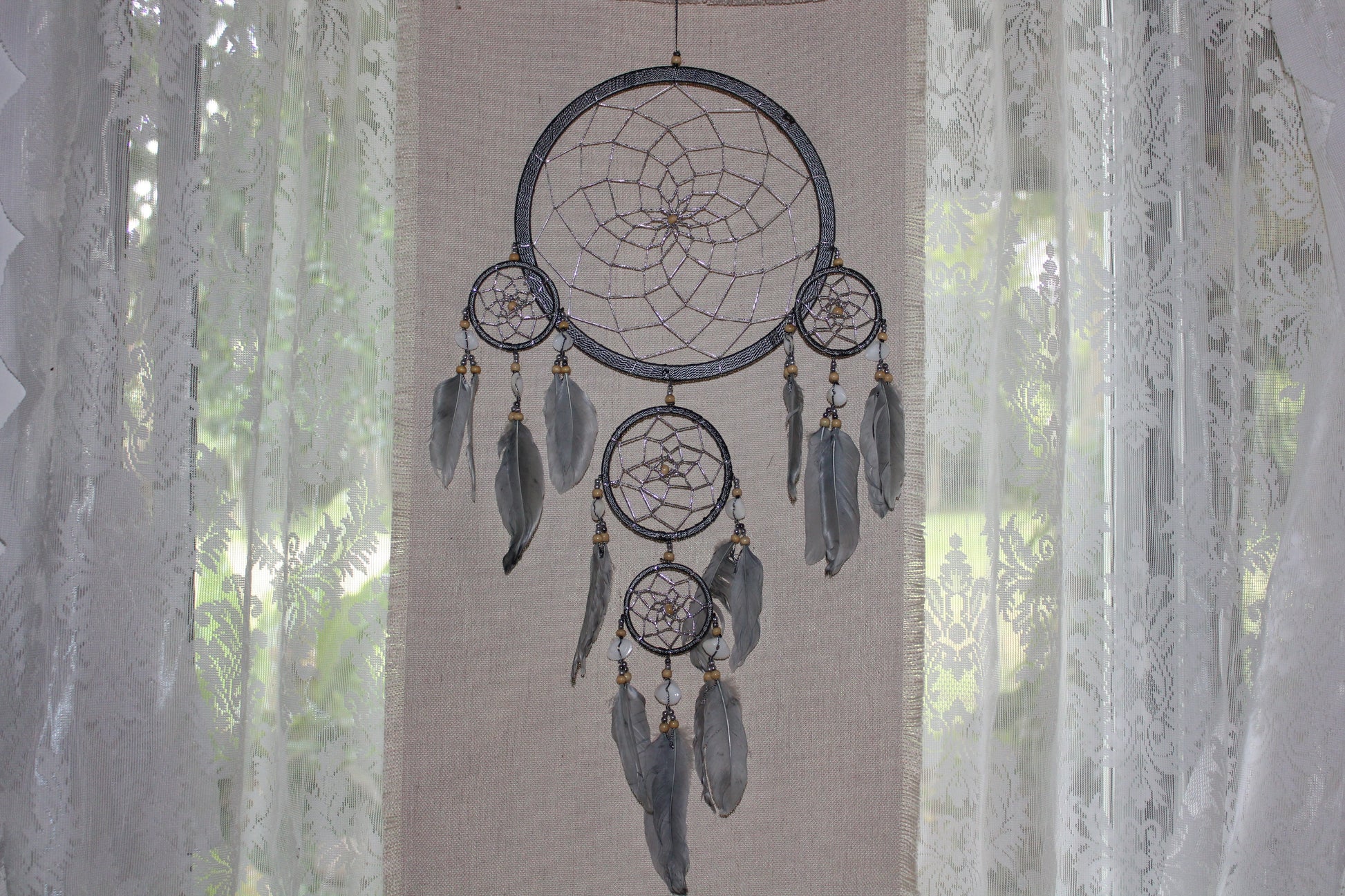This Grey, 5 ring Dreamcatcher has pippi shells, silver webbing, silver and timber beads with feathers.