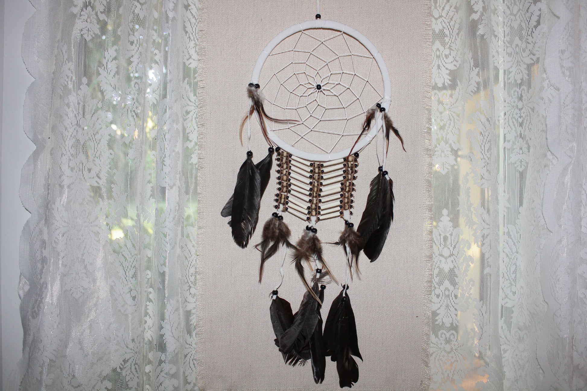 This White (Native American design) Dreamcatcher has a 20 cross bead drop with feathers.