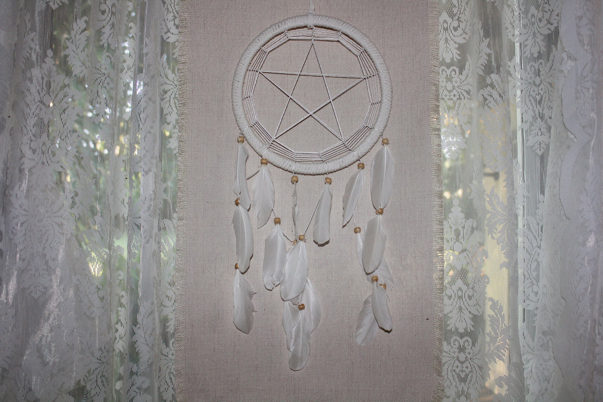 This White Dreamcatcher is detailed with a large Pentagram in the centre, timber beads and feathers.