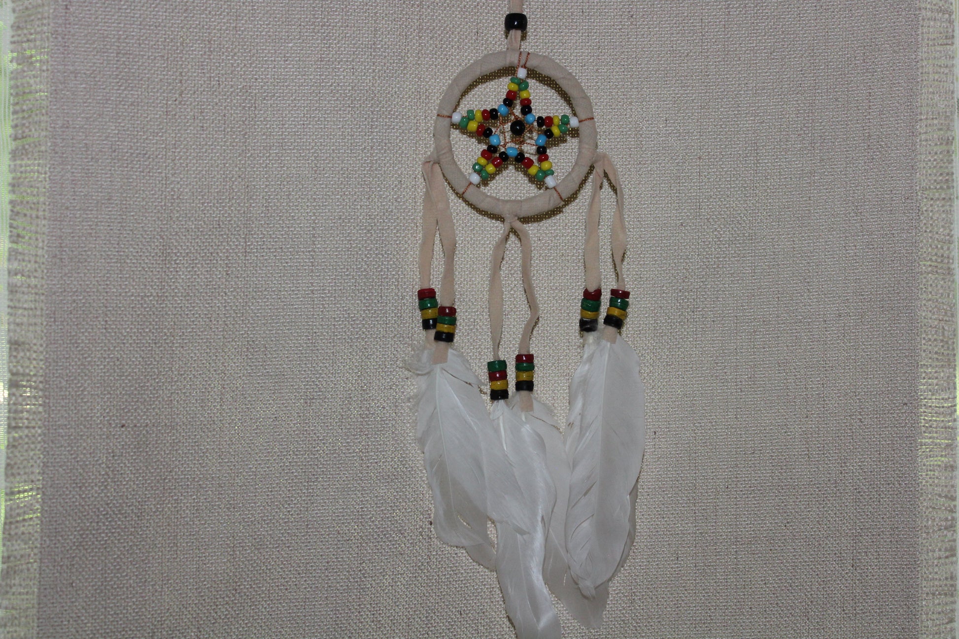 This Beige Dreamcatcher has coloured beads in star pattern and feathers.