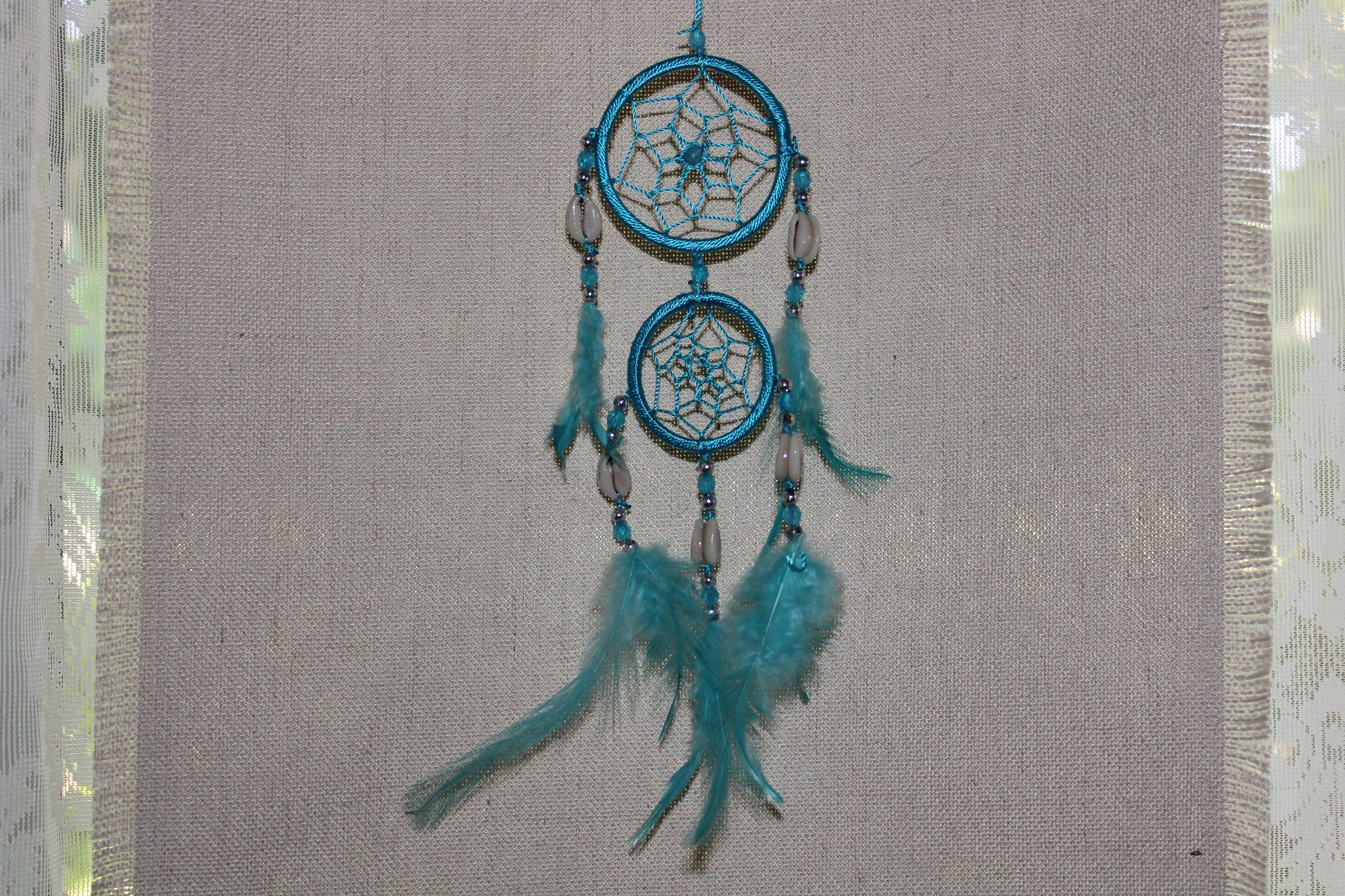 This Blue, 2 ring Dreamcatcher has cowrie shells, silver beads and feathers.