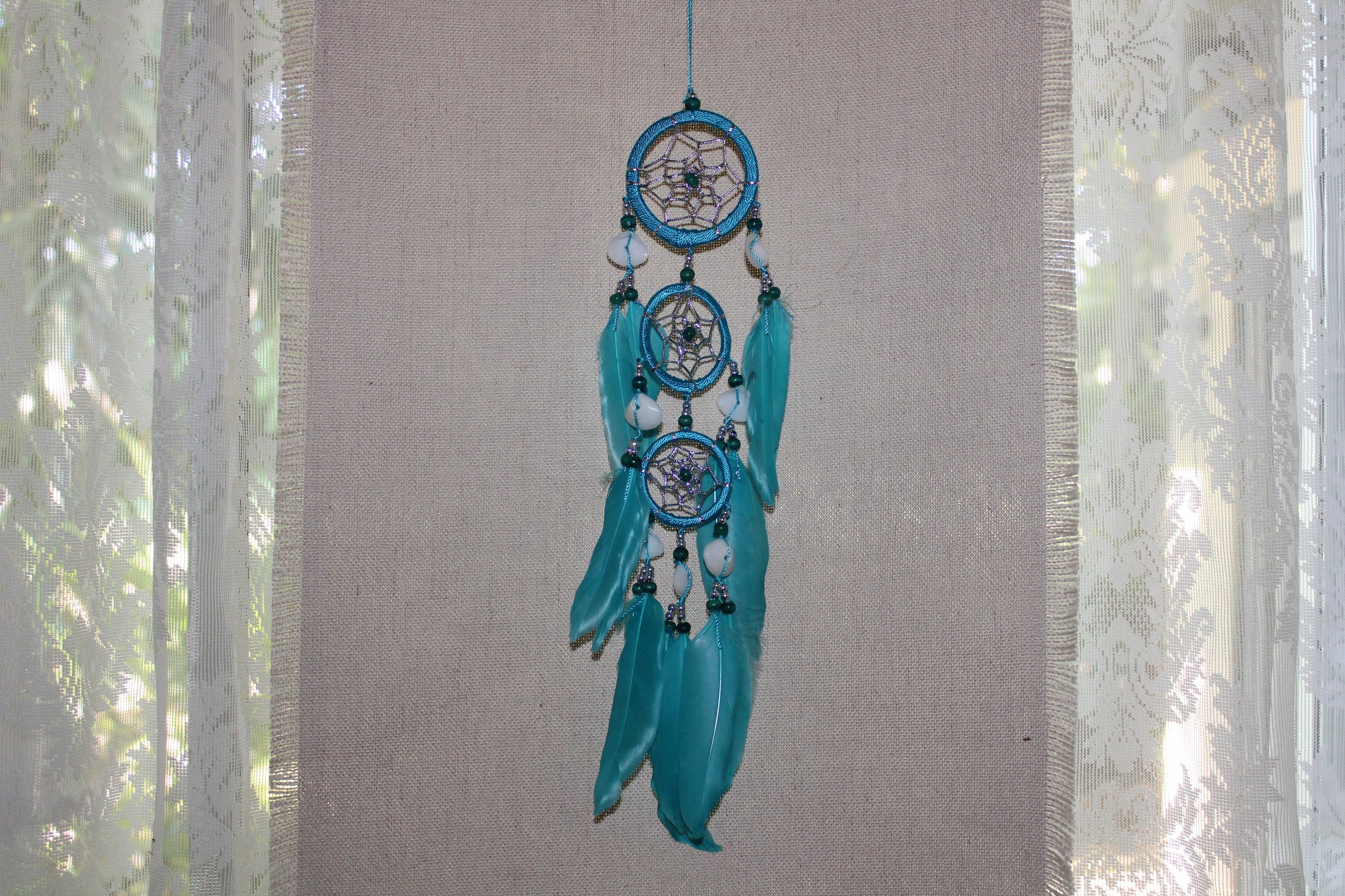 This Blue Dreamcatcher has pippy shells, silver webbing, green and silver beads with feathers.