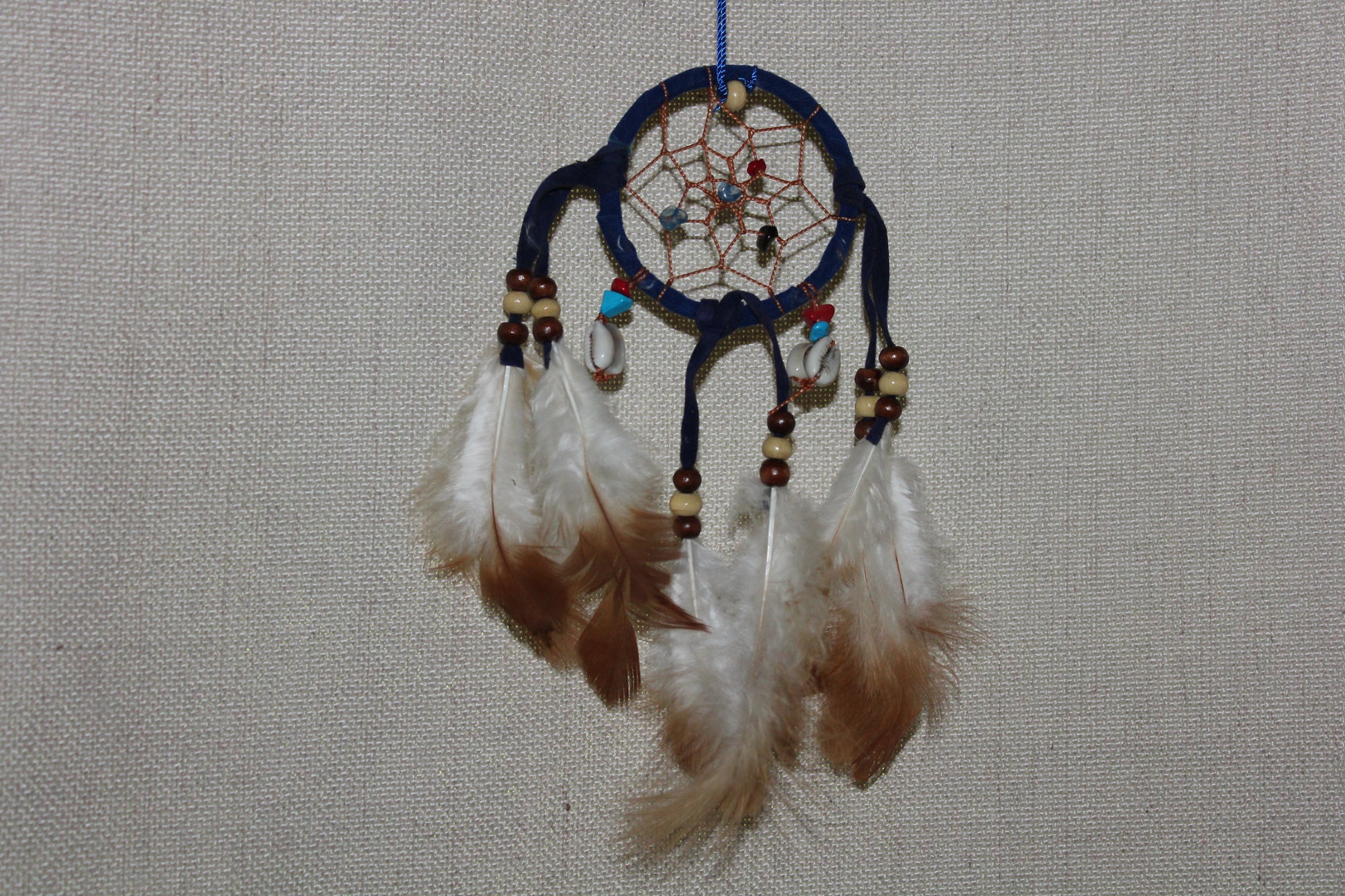 This Dark Blue Dreamcatcher has Blue Howlite & Red Coral chips, cowrie shells, timber beads and feathers.