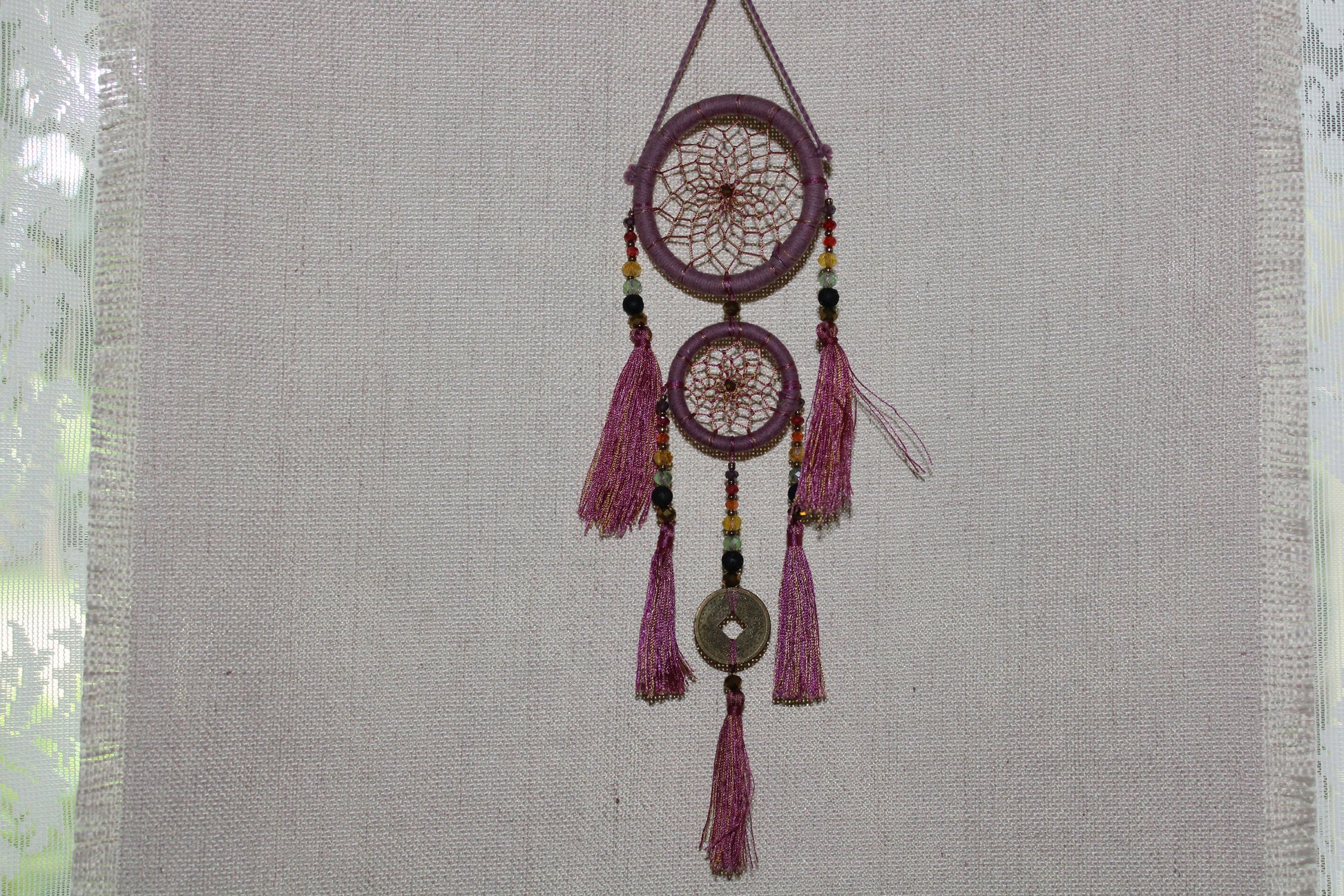 This Purple (metal ring) Dreamcatcher has multi coloured faceted beads, Chinese coins and purple tassels.