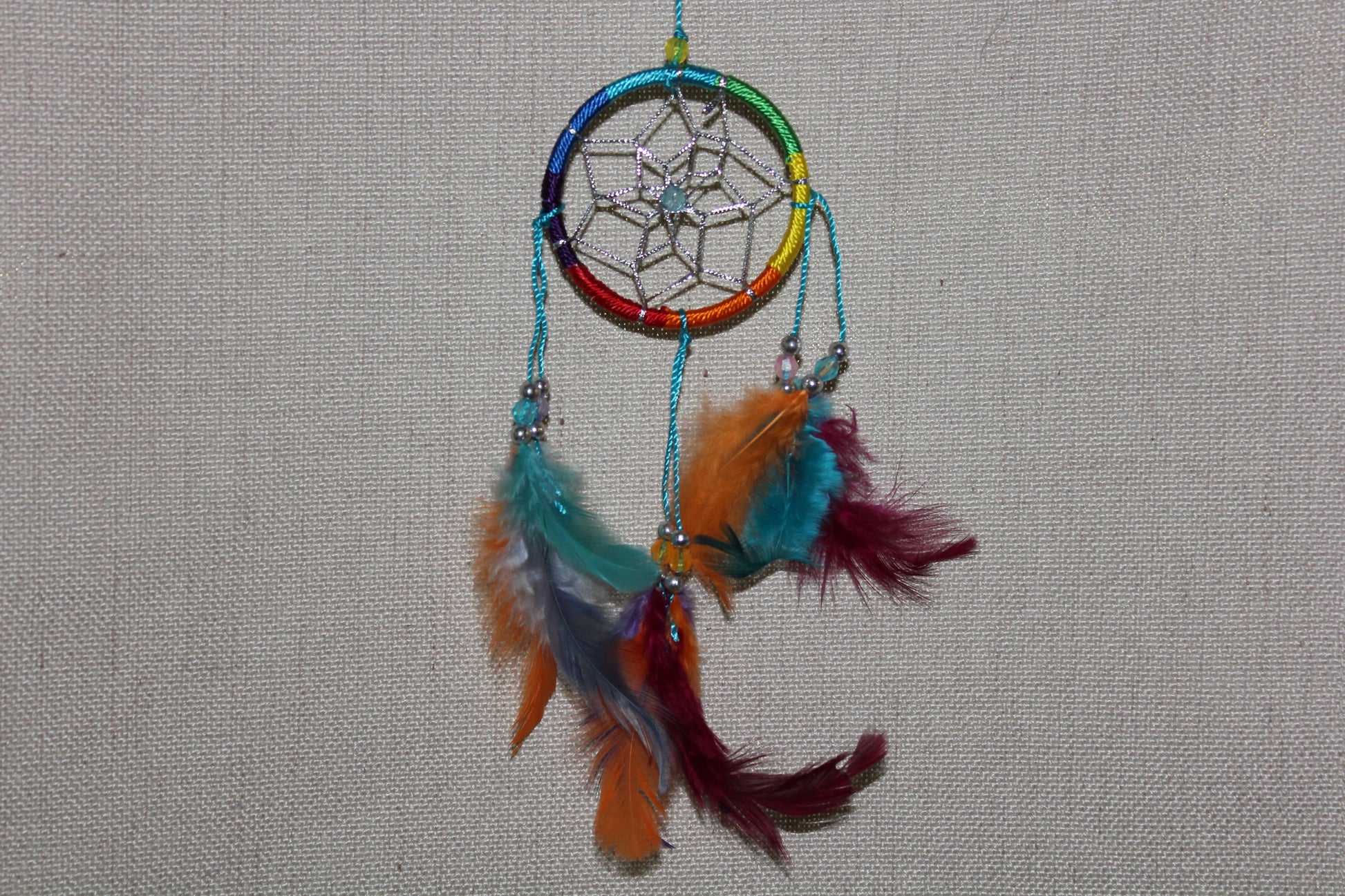 This Rainbow Dreamcatcher has silver webbing, silver beads and feathers.