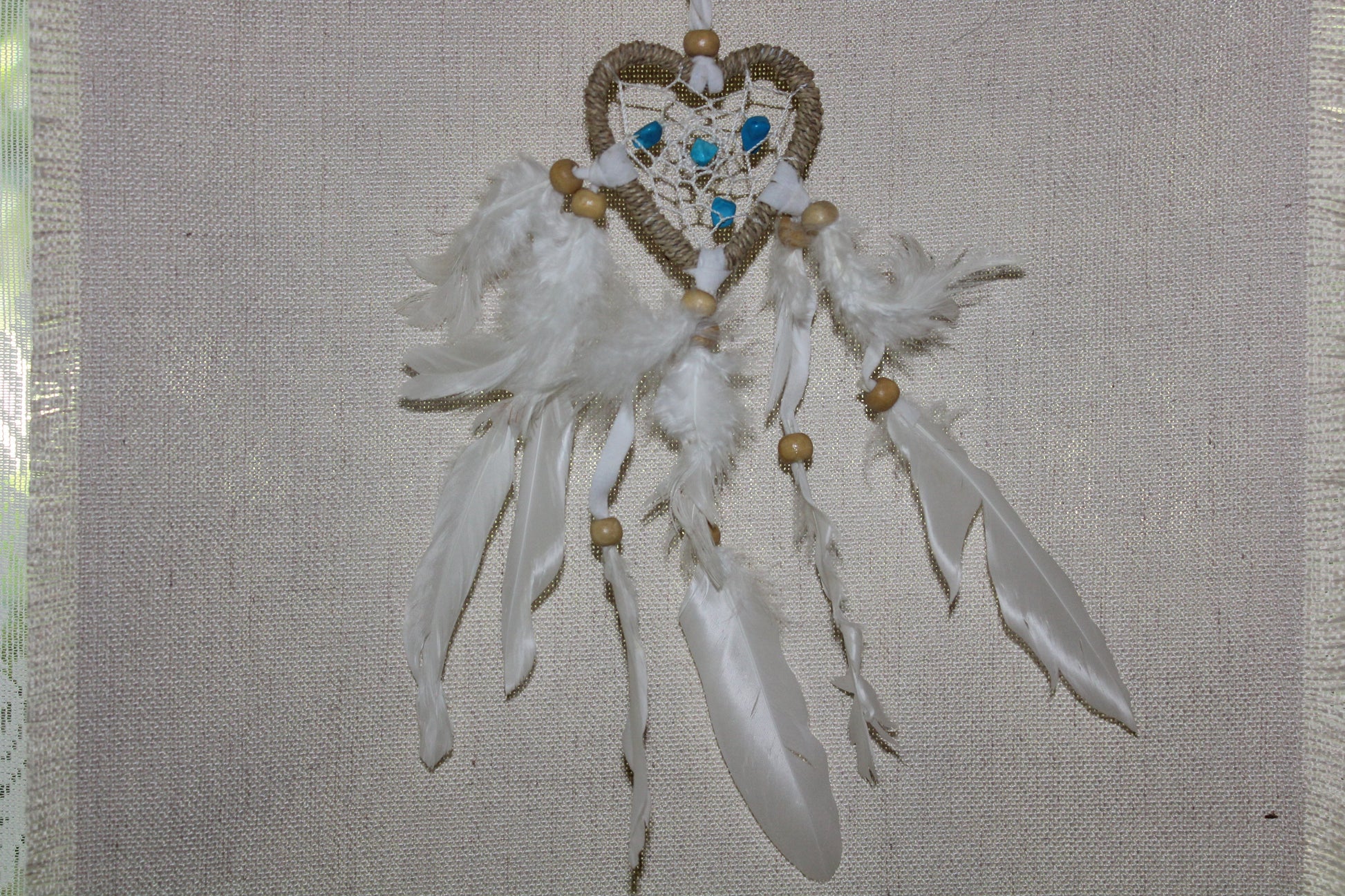 This Ratan, Heart shaped Dreamcatcher has Blue Howlite chips, white webbing, timber beads and feathers.
