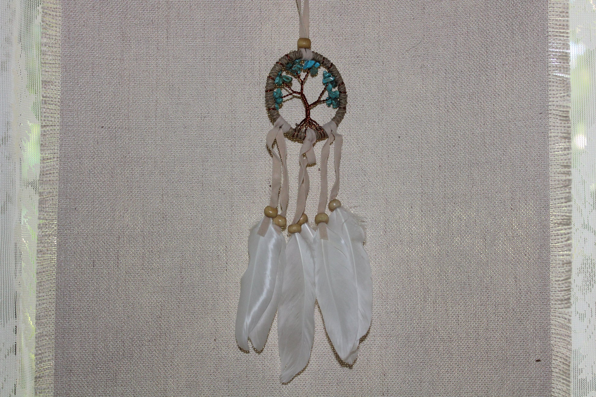 This Ratan Dreamcatcher is detailed with the Tree of Life (copper wire) in the centre, Blue Howlite chips, timber beads and white feathers.