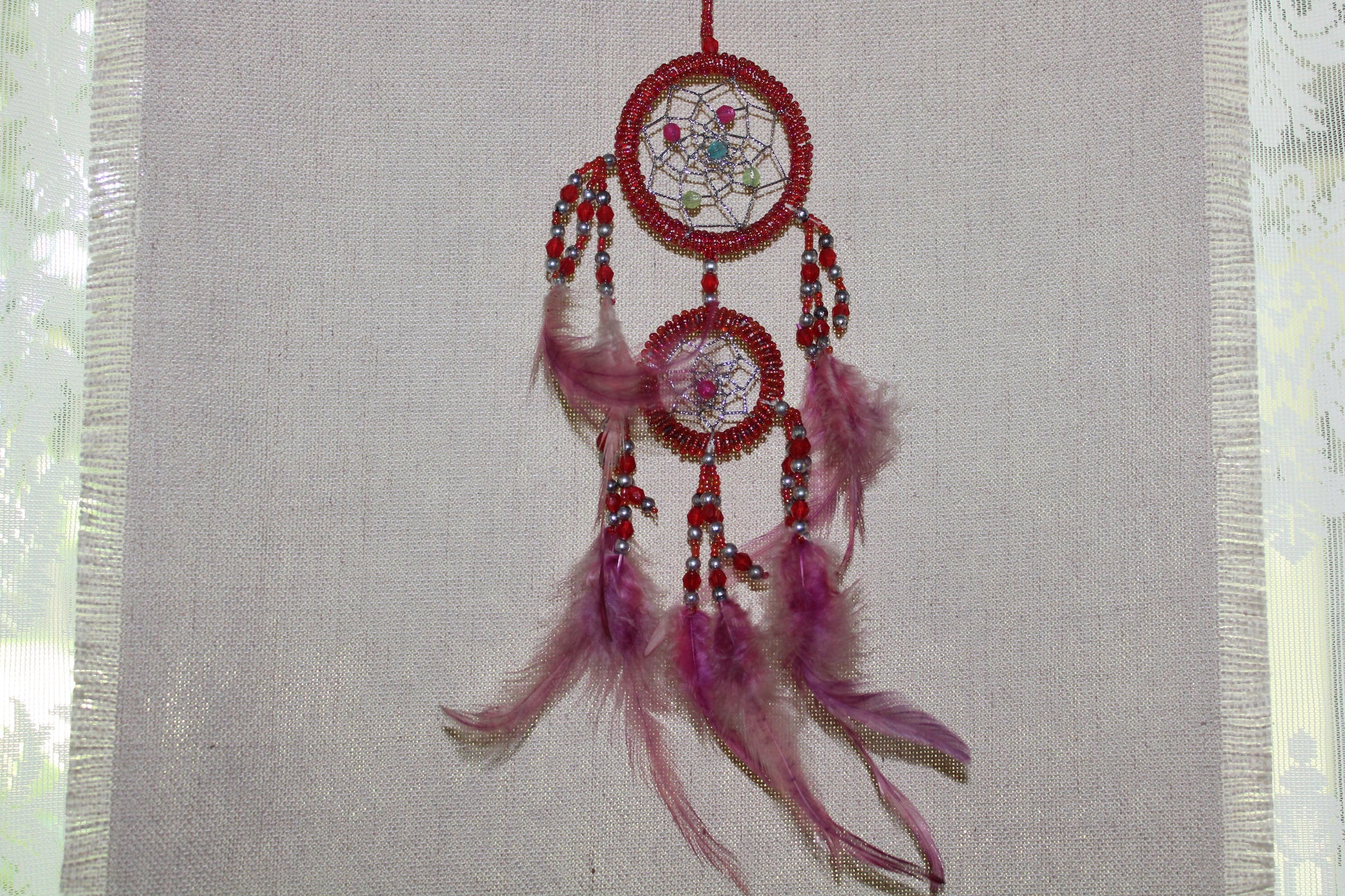 this Red Dreamcatcher has bling red and silver beads with feathers.