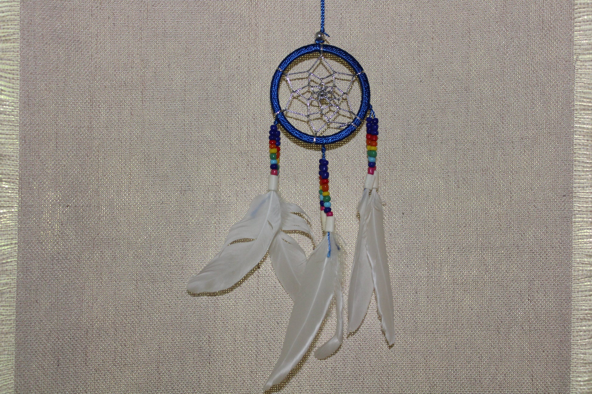 This Royal Blue Dreamcatcher has silver webbing, coloured beads and feathers.