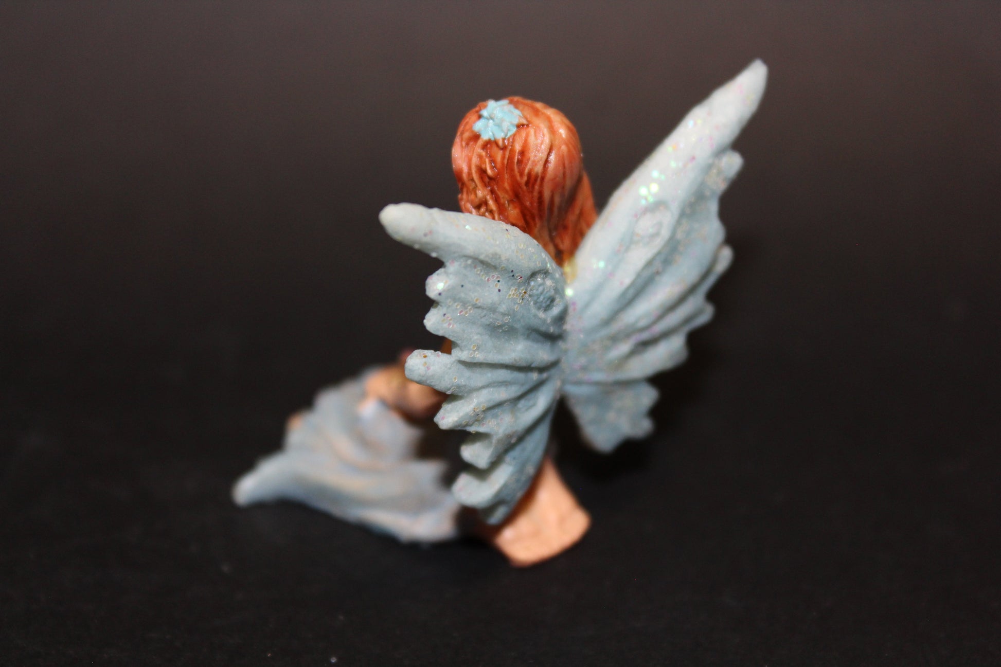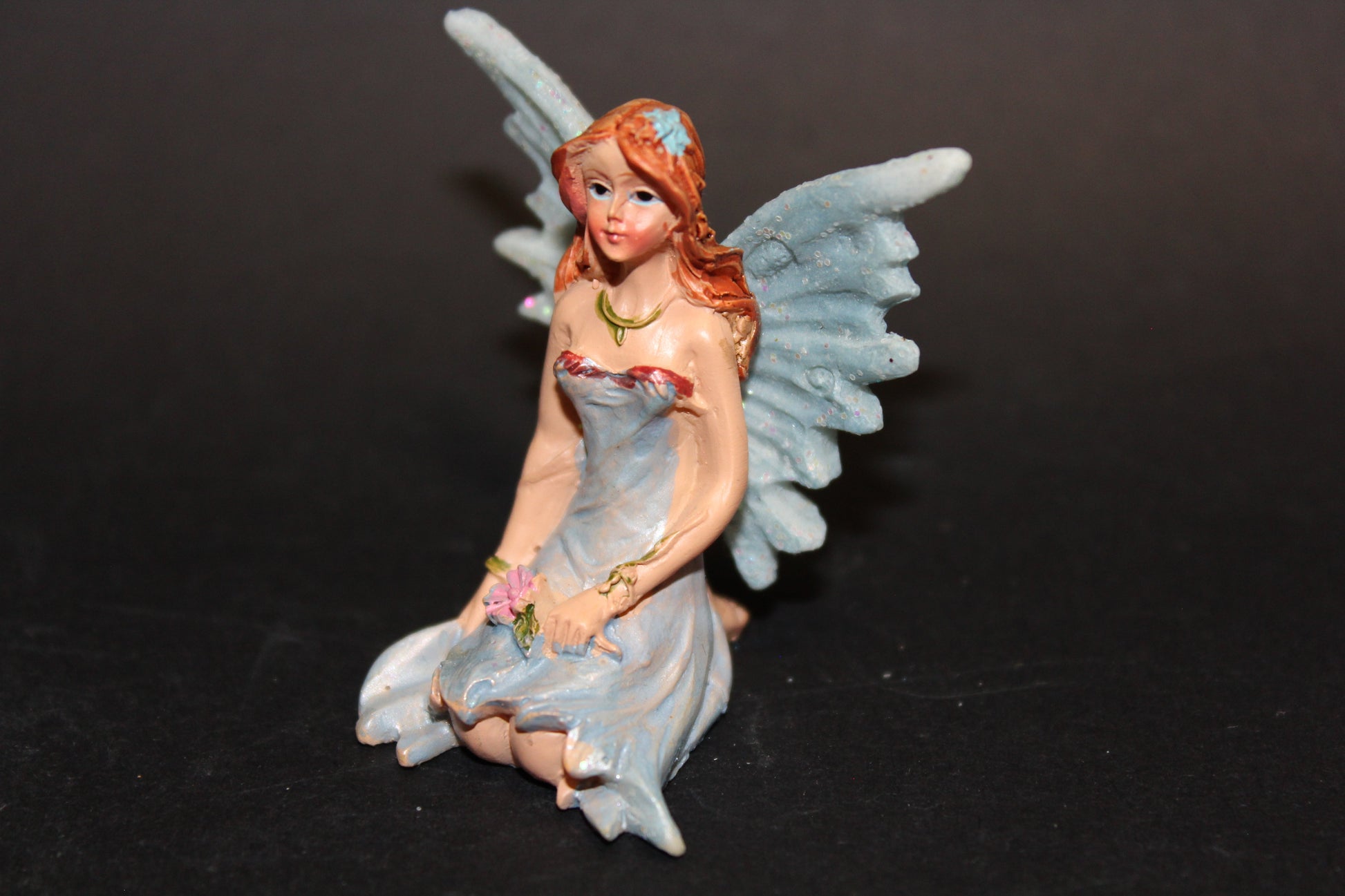 This cute little fairy is sitting in a blue dress with her wings out.
