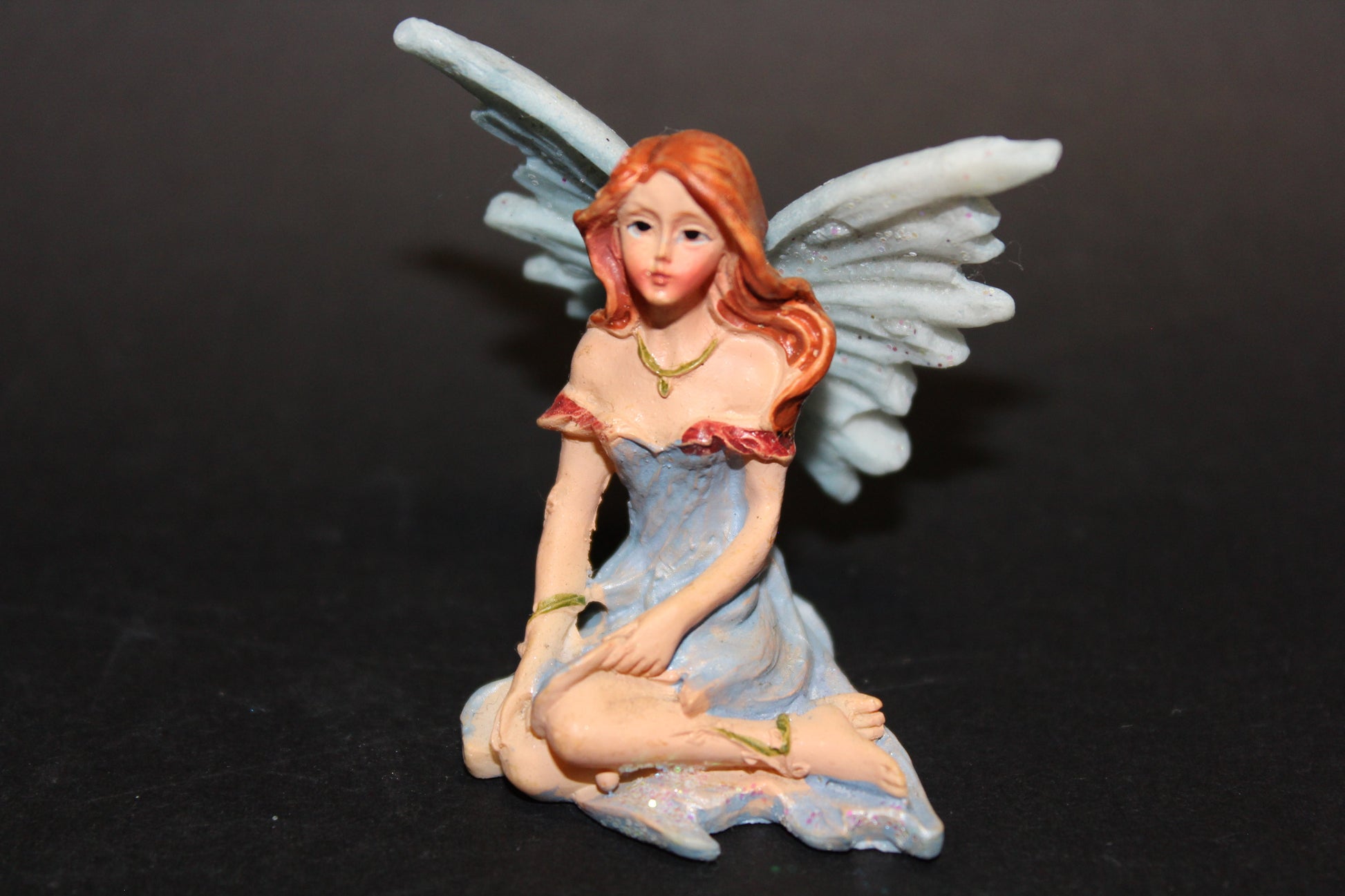 This cute little fairy is sitting in a blue dress with her knees crossed and her wings out.