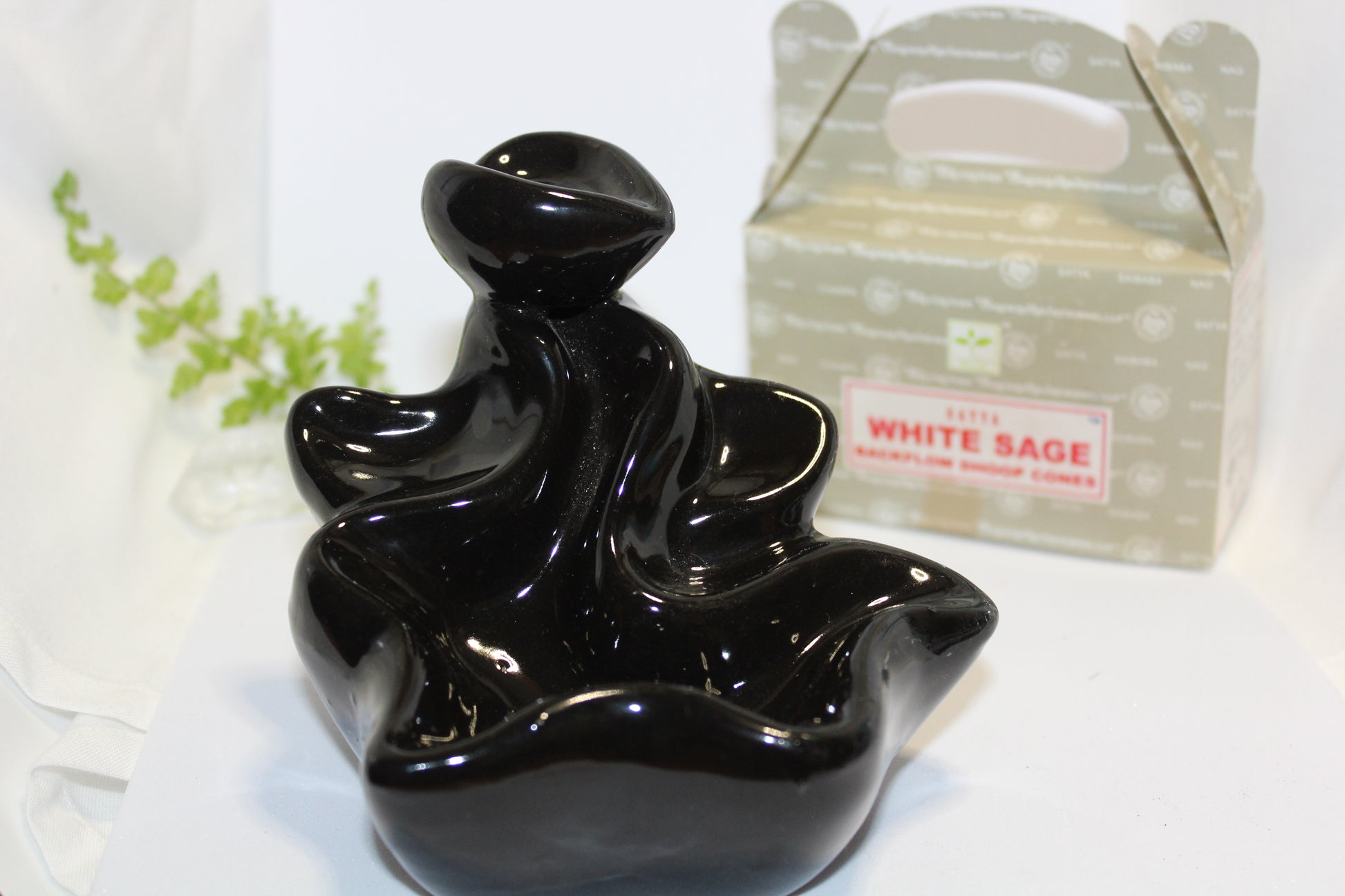 Black ceramic waterfall with heart at top - smooth finish. Backflow incense burner.