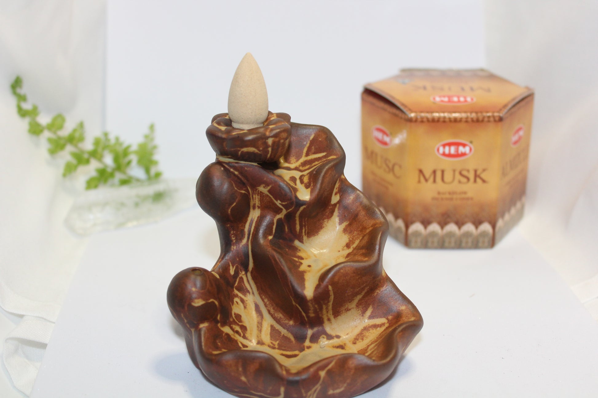 Brown ceramic flower and leaves - waterfall backflow incense burner.