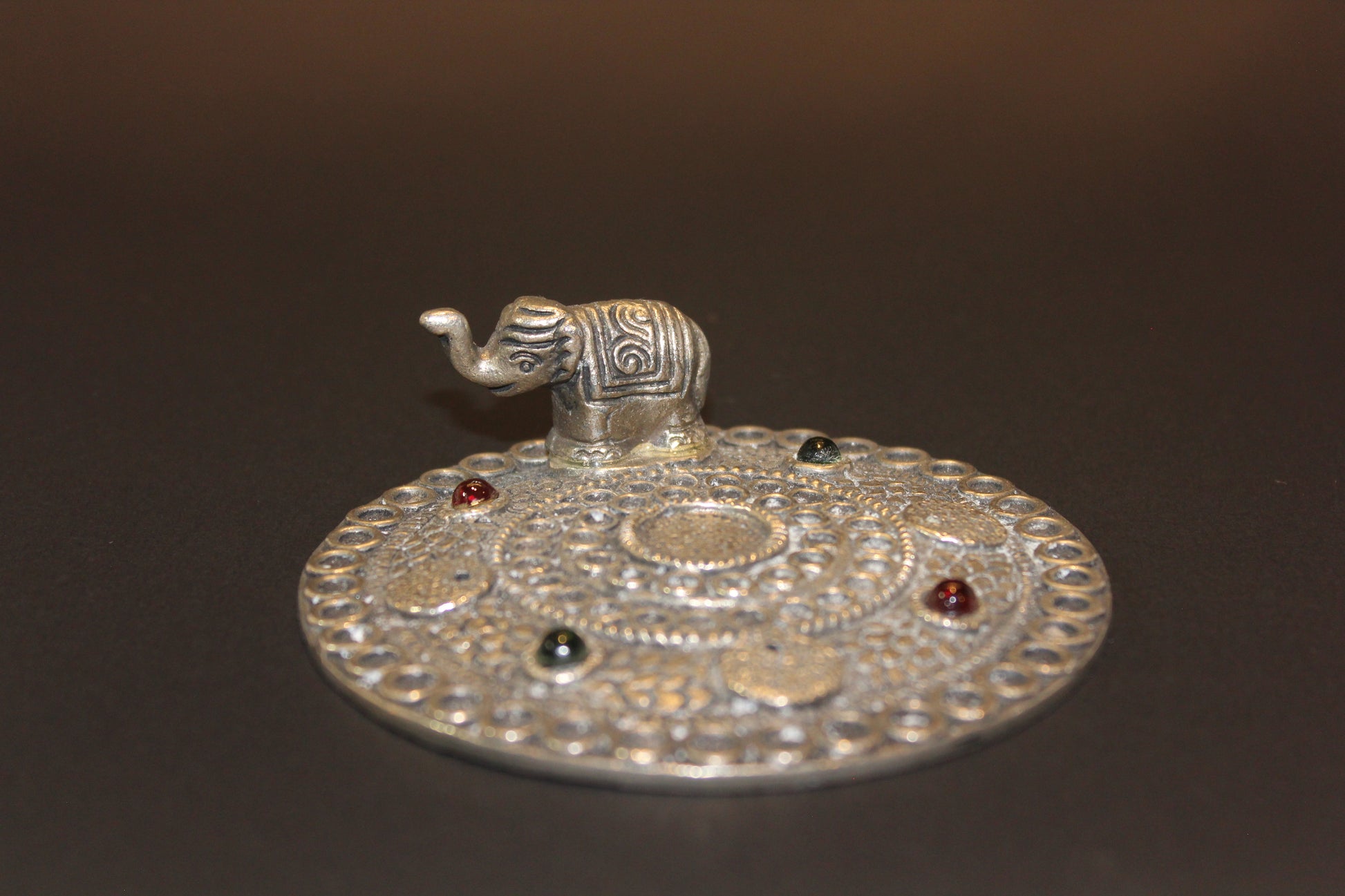 Incense holder - round plate, decorated with elephant, carvings & crystals.