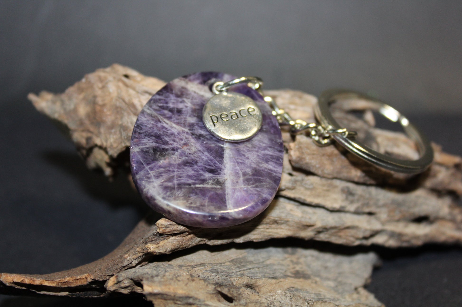 This Amethyst Palmstone Keyring is 100mm (l) x 35mm (w) and is presented in an Organza Bag with the relevant crystal 'property card'.