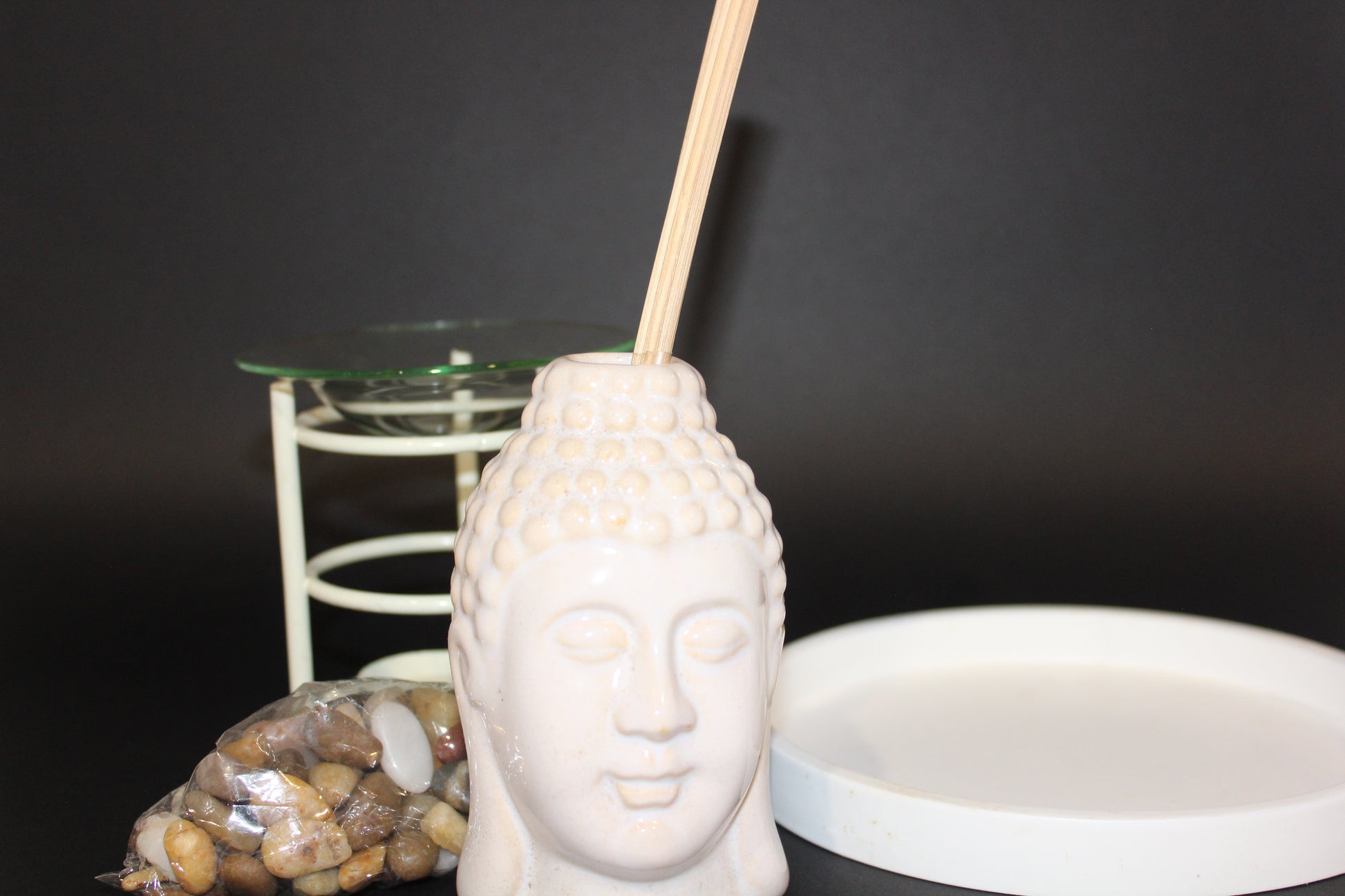 5 pieces: plate - 170mm diameter, oil burner - 110mm high & 100mm diameter glass bowl and reed diffuser - Buddha 110mm high.