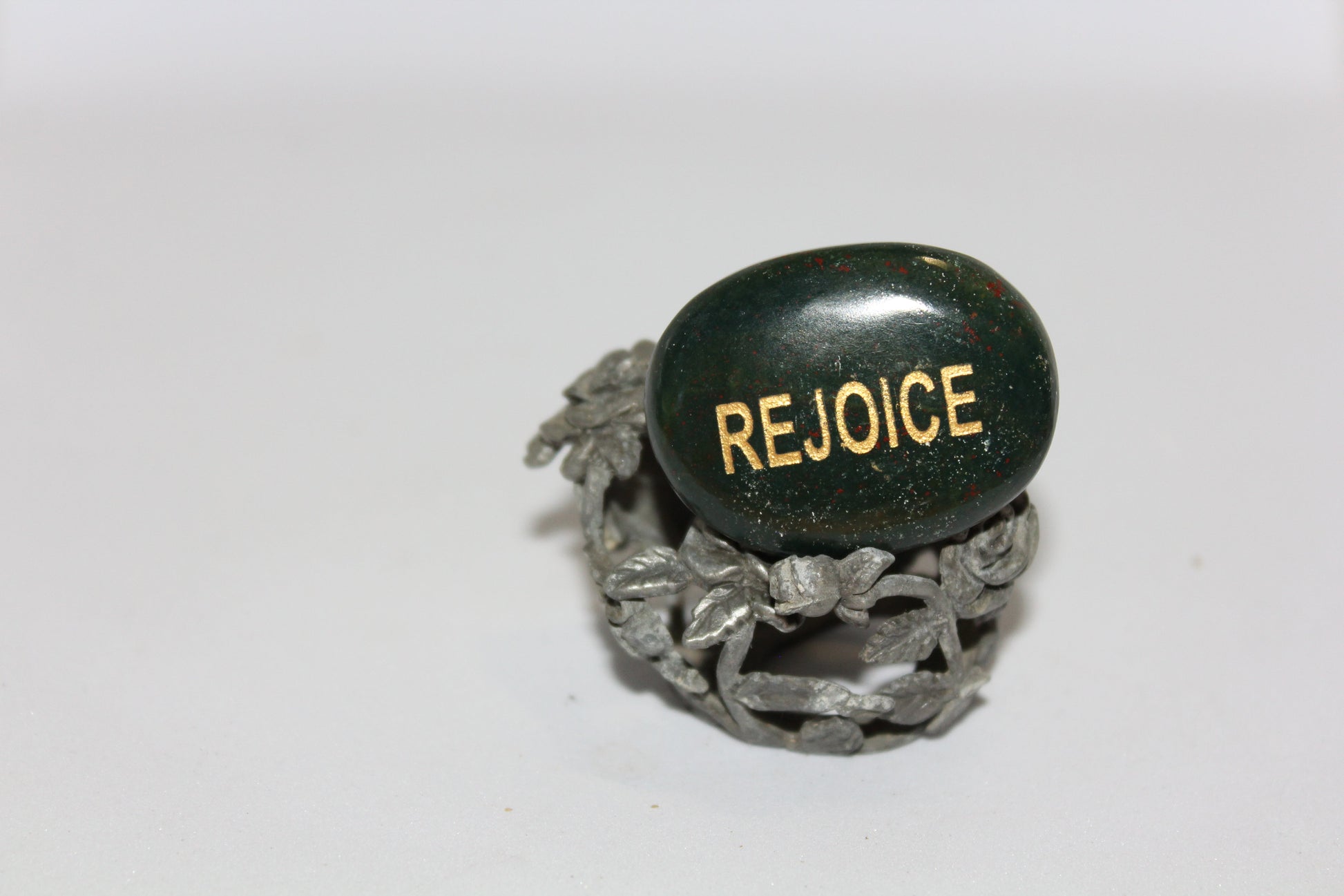 This beautiful Bloodstone palmstone is 40mm (h) x 30mm (w) and embossed with the word - rejoice. Metaphysically, it will offer physical healing.