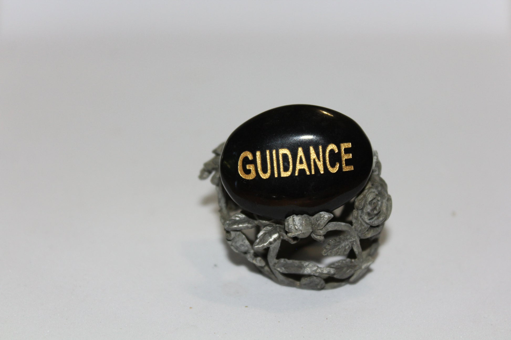 This beautiful Onyx palmstone is 40mm (h) x 30mm (w) and embossed with the word - guidance. Metaphysically, it will offer strength, alleviating fear.