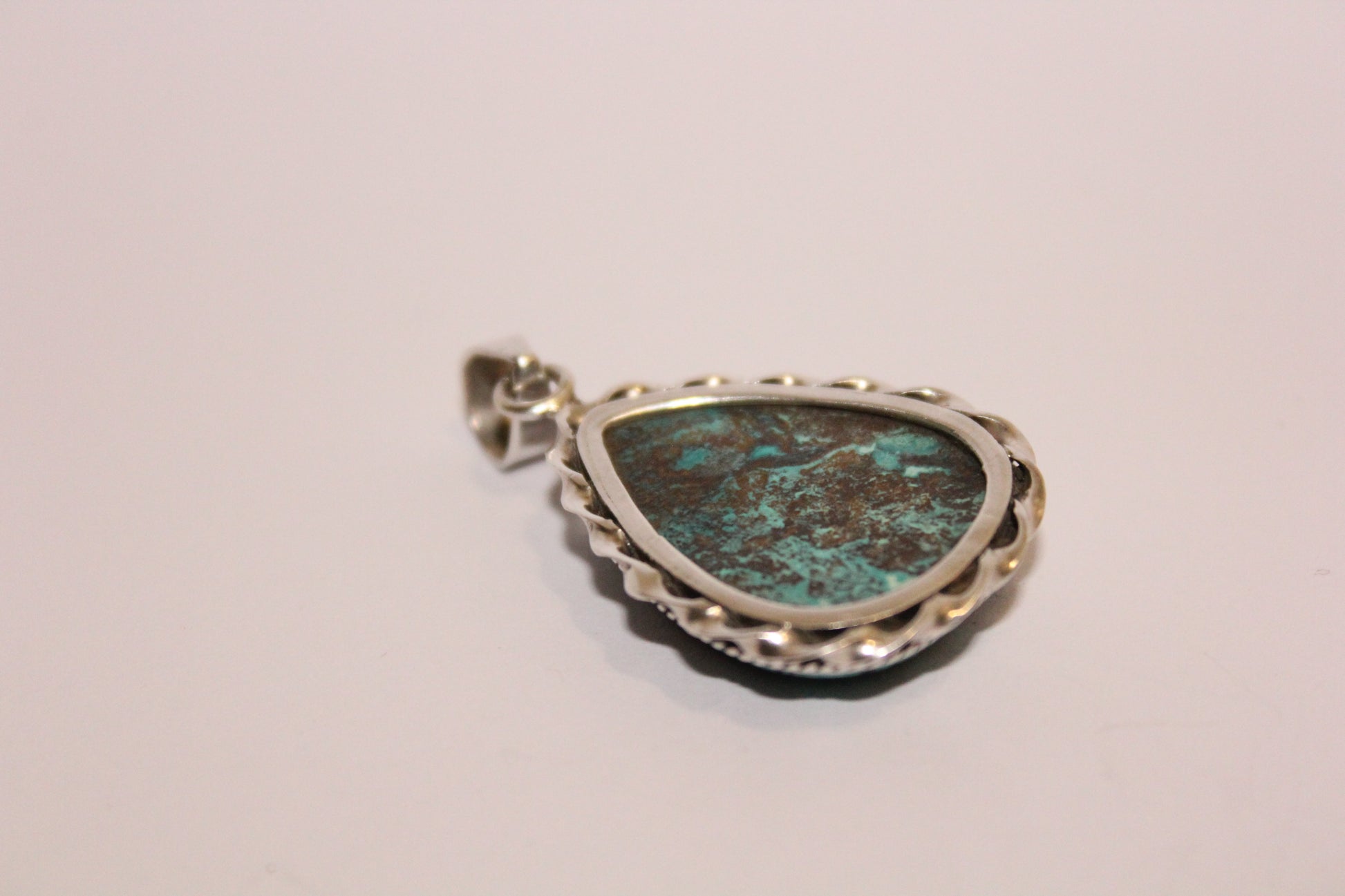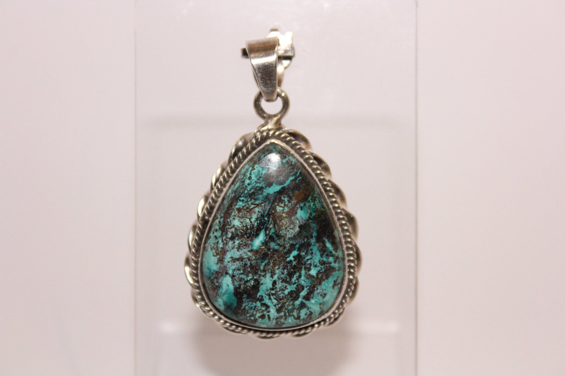 This beautiful Chrysocolla Pendant is set in Stirling Silver and is approx - 40mm (l) x 25mm (w).
