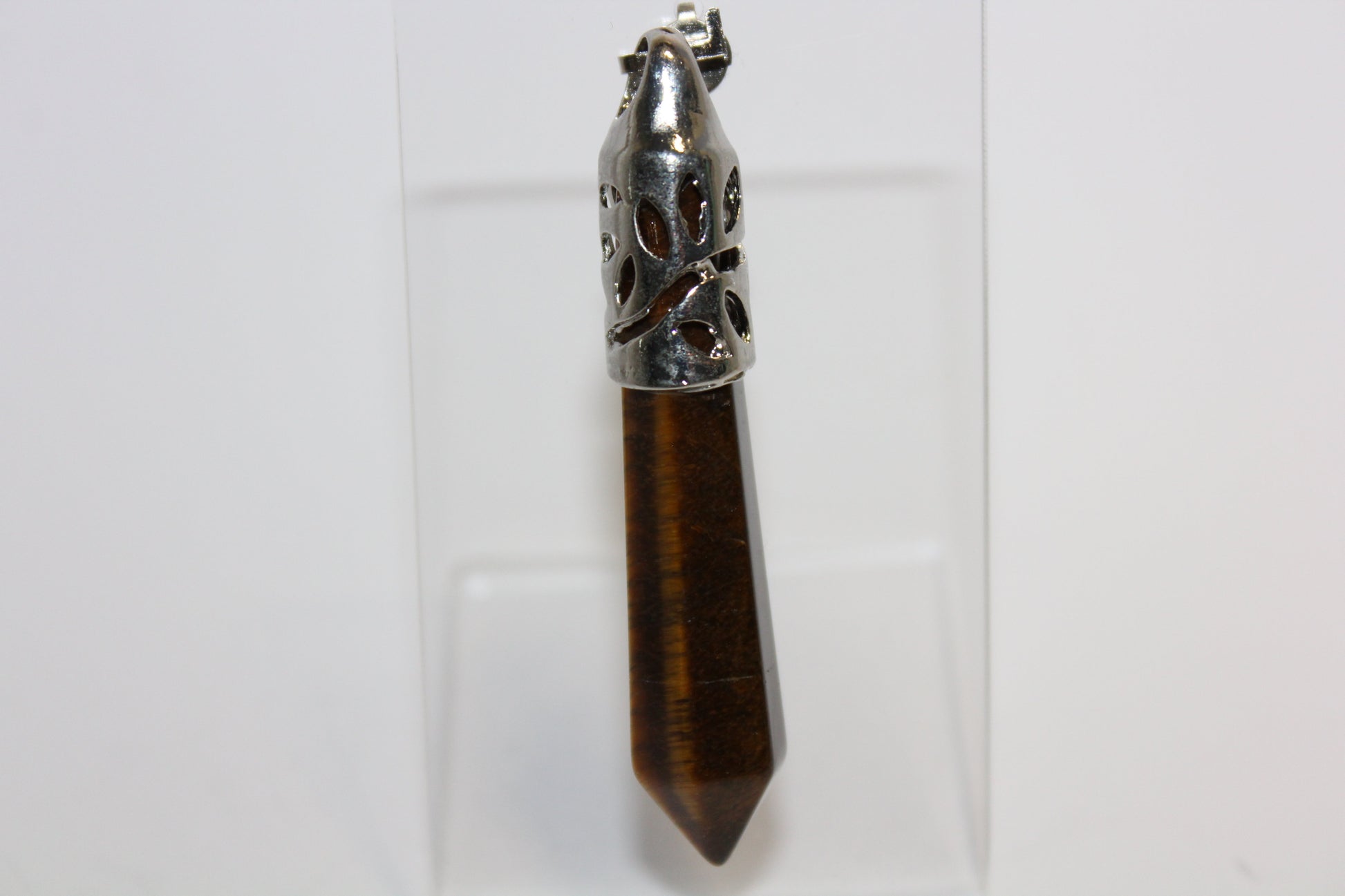 This beautiful Tiger Eye wand style pendant is approx - 65mm (l) x 10mm (w) and includes a free, adjustable black cotton necklace..
