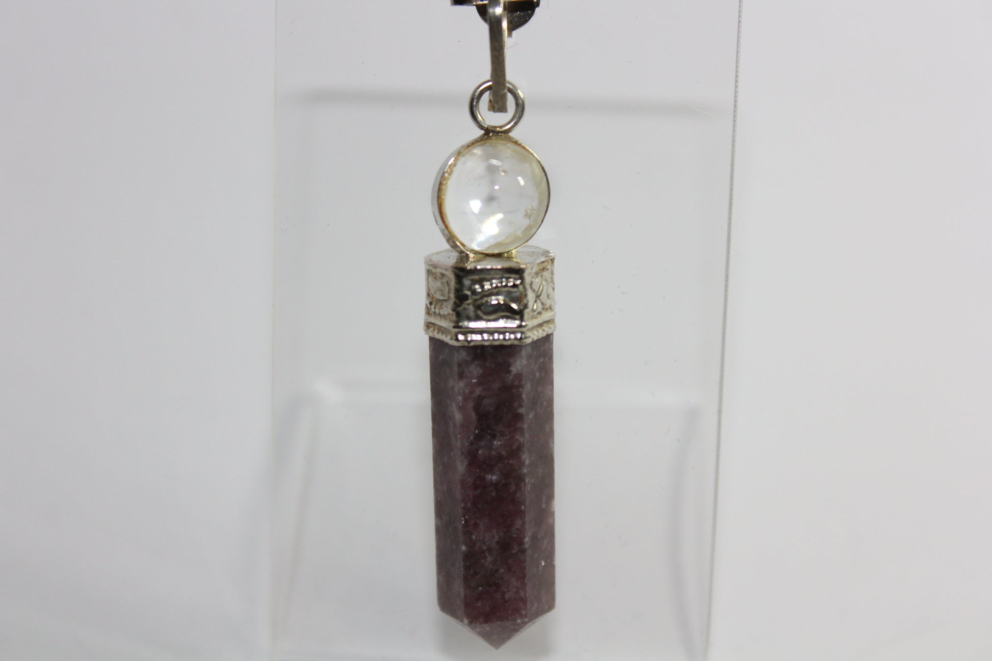 This beautiful Lepidolite generator style pendant, with a Clear Quartz sphere at the top, is approx - 45mm (l) x 10mm (w) and includes a free, adjustable black cotton necklace..