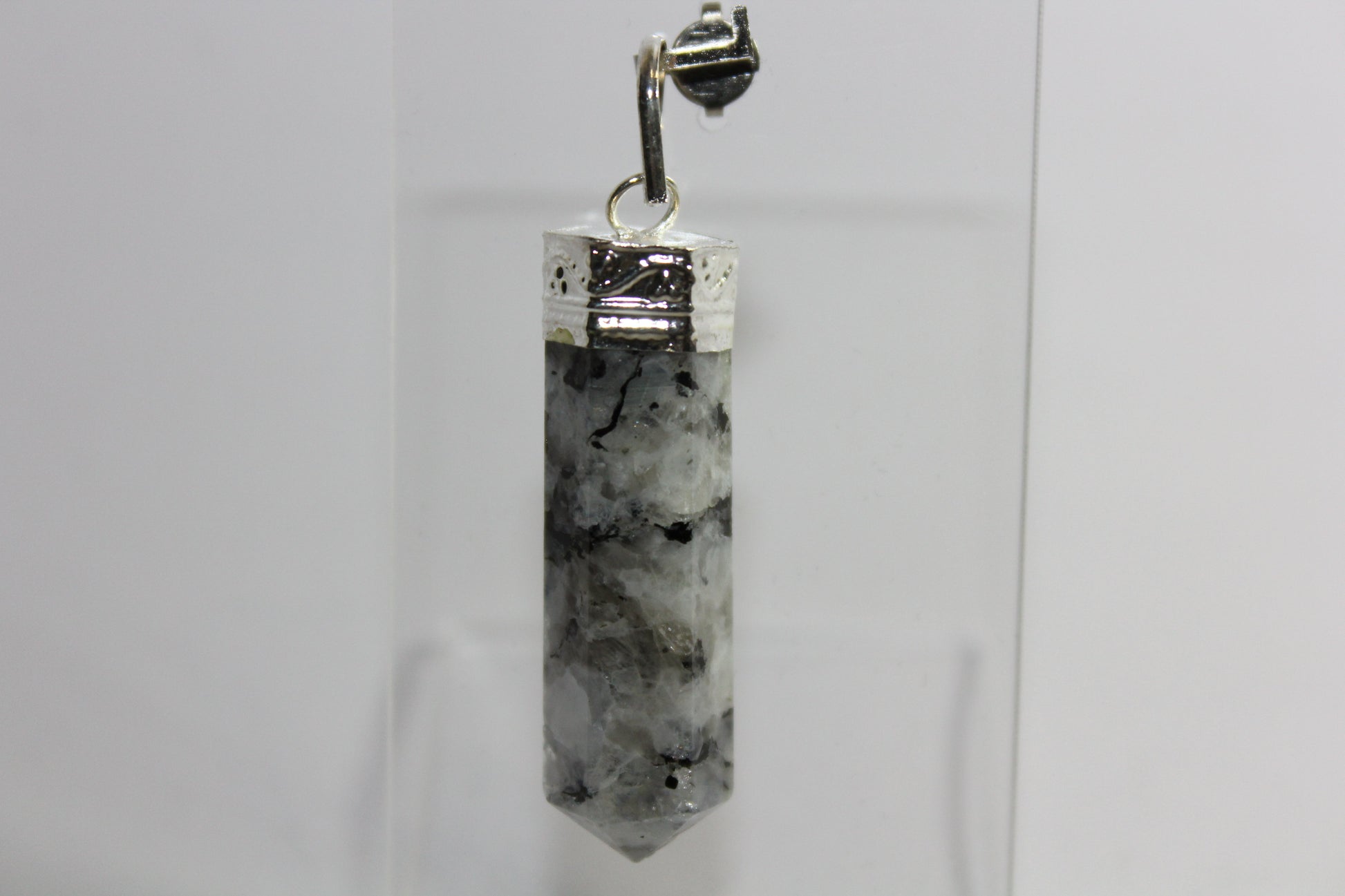 This beautiful Moonstone generator style pendant is approx - 45mm (l) x 10mm (w) and includes a free, adjustable black cotton necklace..