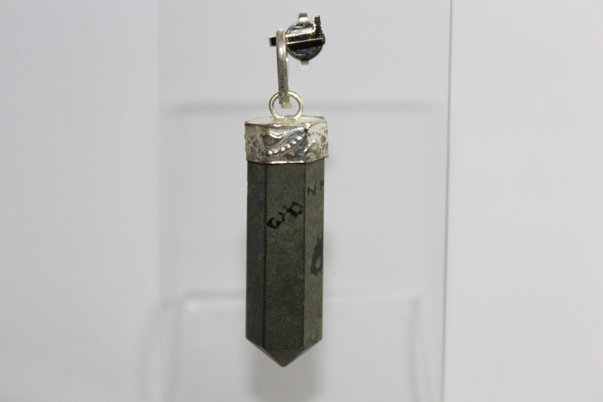 This beautiful Pyrite generator style pendant is approx - 45mm (l) x 10mm (w) and includes a free, adjustable black cotton necklace..