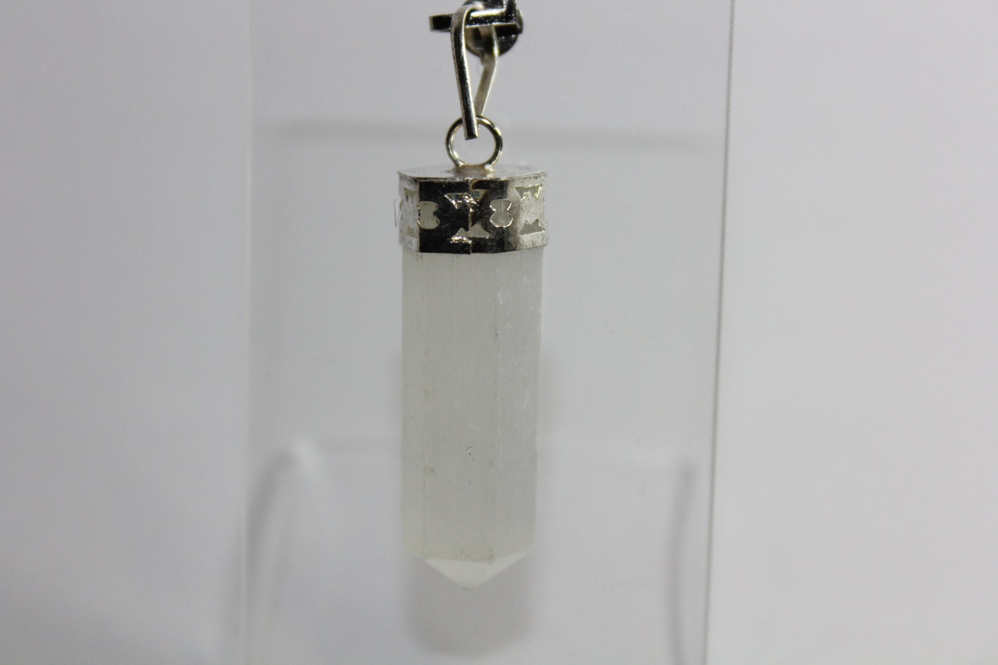 This beautiful Selenite generator style pendant is approx - 45mm (l) x 10mm (w) and includes a free, adjustable black cotton necklace..