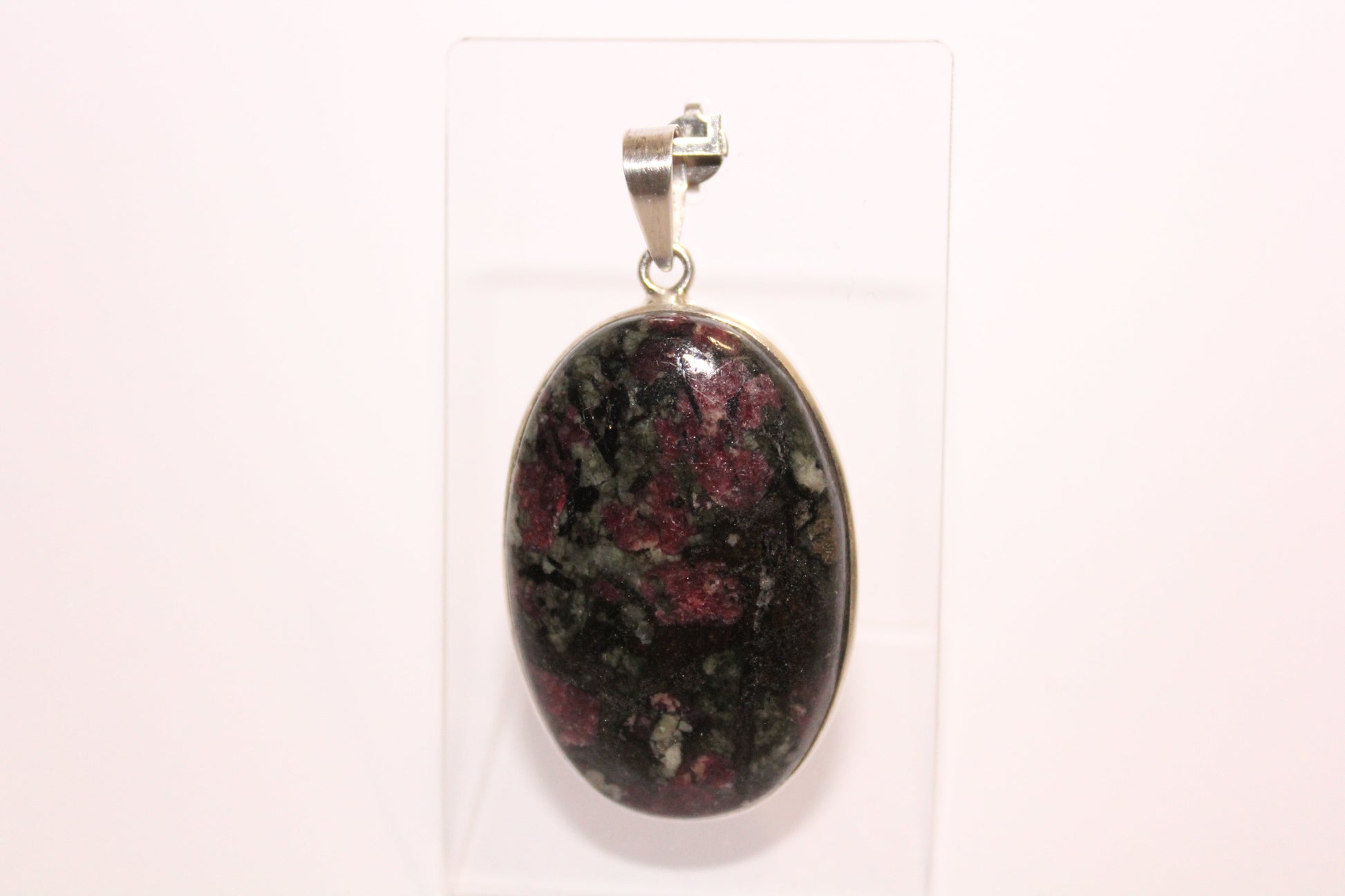 This beautiful Eudialyte Pendant is set in Stirling Silver and is approx - 55mm (l) x 30mm (w).