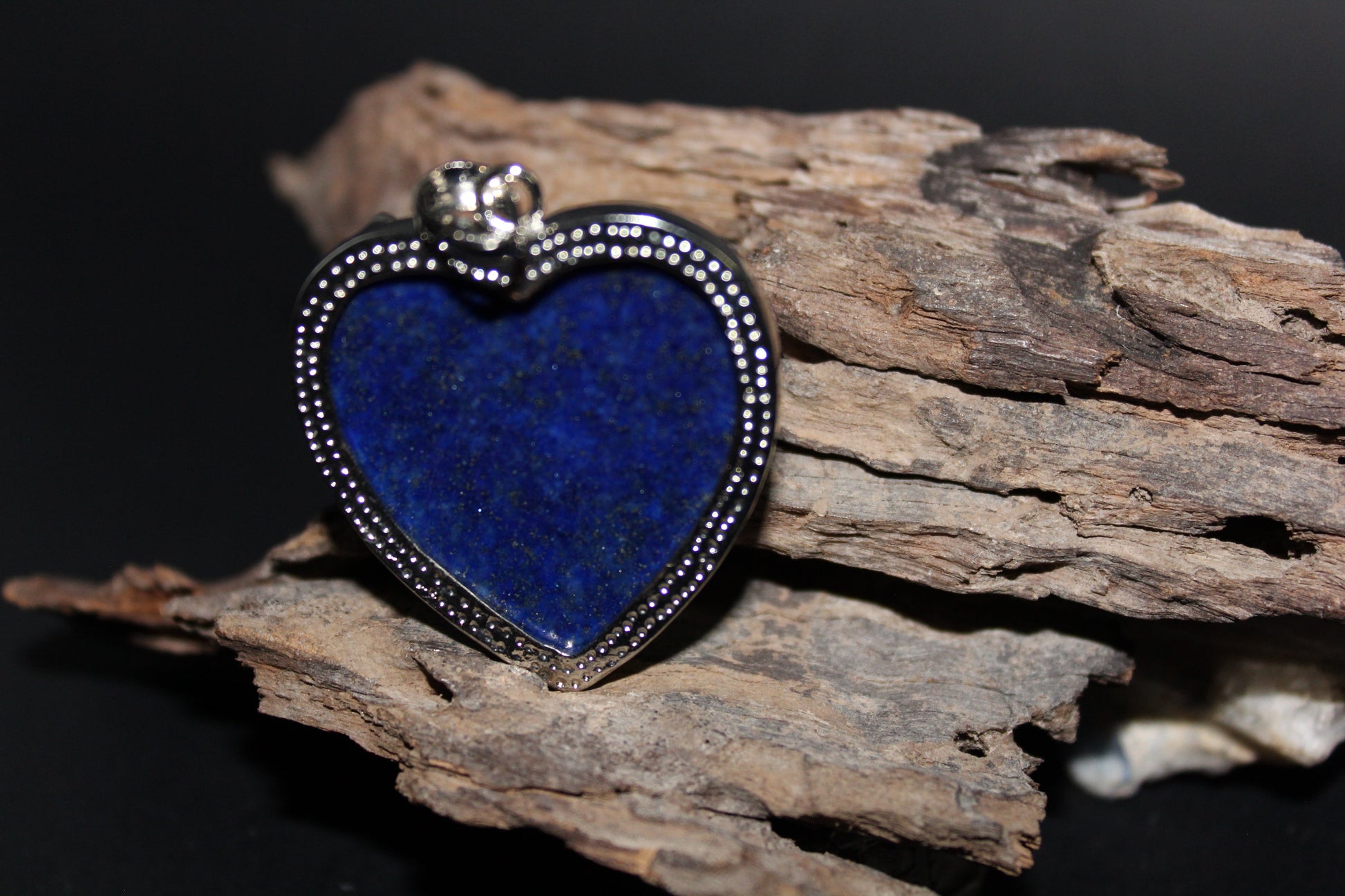 This Lapis Lazuli Pendant is set in a Heart shape with a Flower design and is approx - 45mm (l) x 30mm (w). Includes adjustable black cotton necklace.