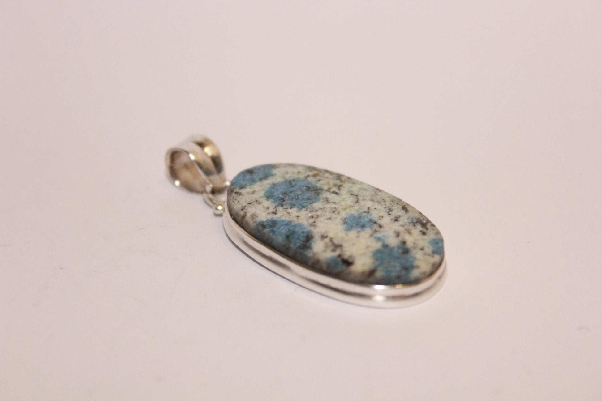 This beautiful Azurite In Granite - K2 Pendant is set in Stirling Silver and is approx - 50mm (l) x 20mm (w).